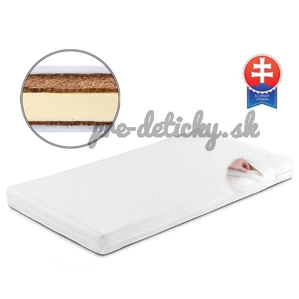 Praktický trojvrstvový matrac. Výplň: 2x vložka z prírodného kokosového vlákna + molitánové jadro.