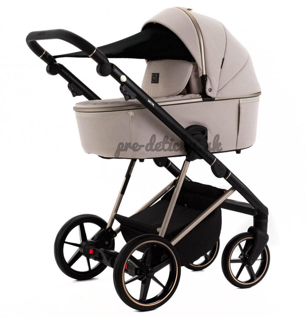 - Delta má praktický systém skladania vaničky, ktorý uľahčuje cestovanie alebo uskladnenie kočíka.