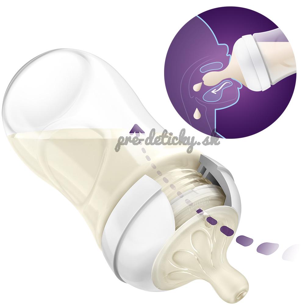 Cumlík Natural Response funguje v súlade s prirodzeným rytmom kŕmenia dieťaťa, takže môžete ľahko kombinovať dojčenie a kŕmenie z fľaše. Má jedinečný otvor, ktorý uvoľňuje mlieko len keď dieťa aktívne pije. Takže, keď si dieťa urobí prestávku na prehltnutie a nadýchnutie, pozastaví sa aj tok mlieka.