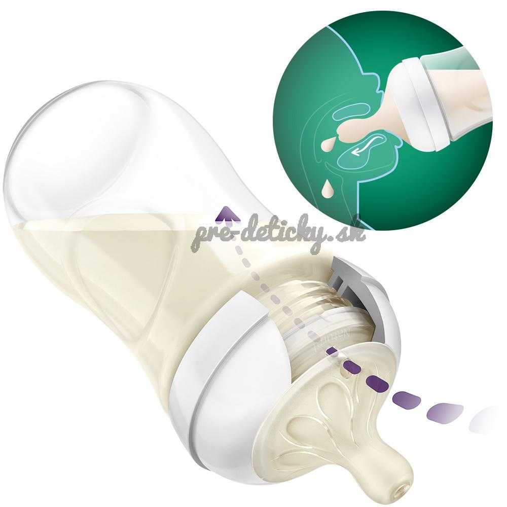 Cumlík Natural Response funguje v harmónii s prirodzeným rytmom kŕmenia dieťaťa, takže môžete ľahko kombinovať dojčenie a kŕmenie z fľaše. Cumlík má jedinečný otvor, ktorý uvoľňuje mlieko len vtedy, keď dieťa aktívne pije. Takže, keď si dieťa urobí prestávku na prehltnutie a nadýchnutie, pozastaví sa aj tok mlieka.