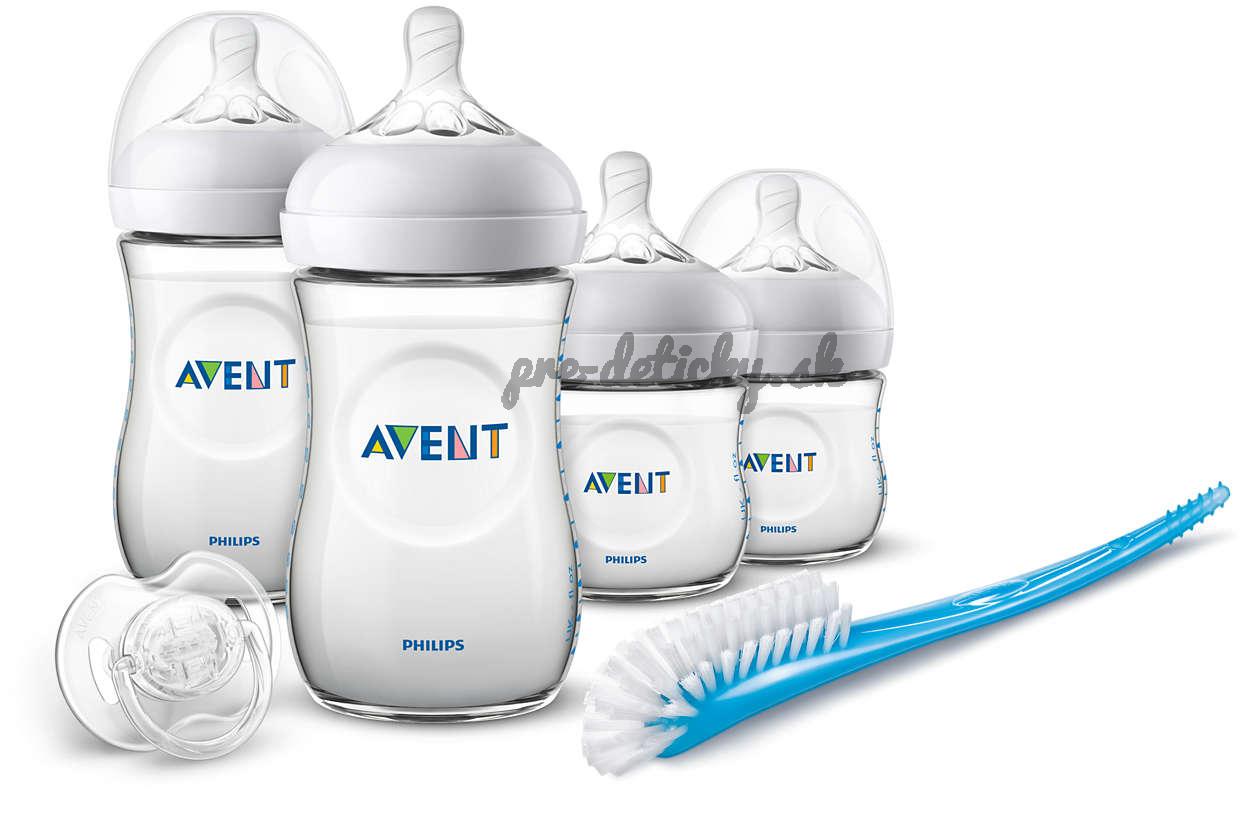Štartovacia sada obsahuje fľaše, cumlík a kefku na fľašky, cumlíky.