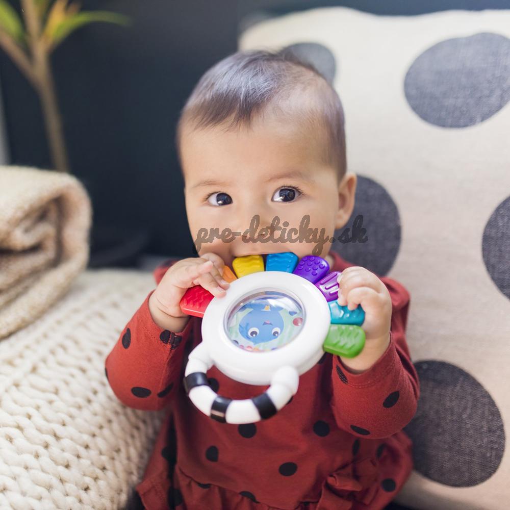 - hračka 3 v1 - hryzačka, hrkálka a senzorická hračka s farebnými textúrami, ktoré stimulujú hmat.