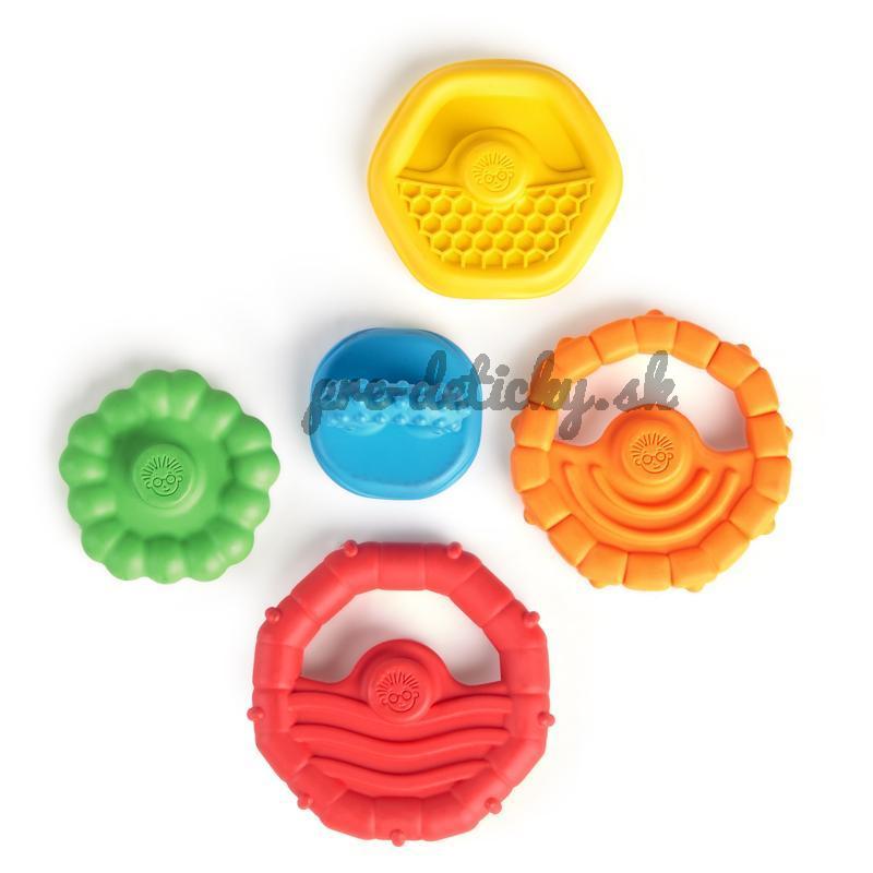 - Stohovacie hryzačky s rôznou textúrou, ktoré sú bezpečné pre malé zúbky.