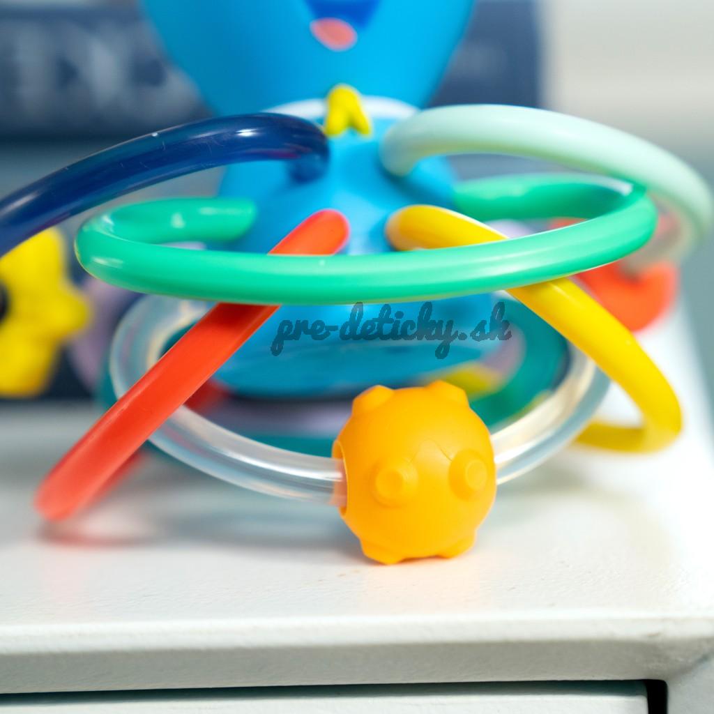 - obsahuje chobotnicu, 6 krúžkov, naháňačku s korálkami a skrytú hrkálku, ktoré zapájajú zmysly dieťaťa počas hry doma alebo na cestách