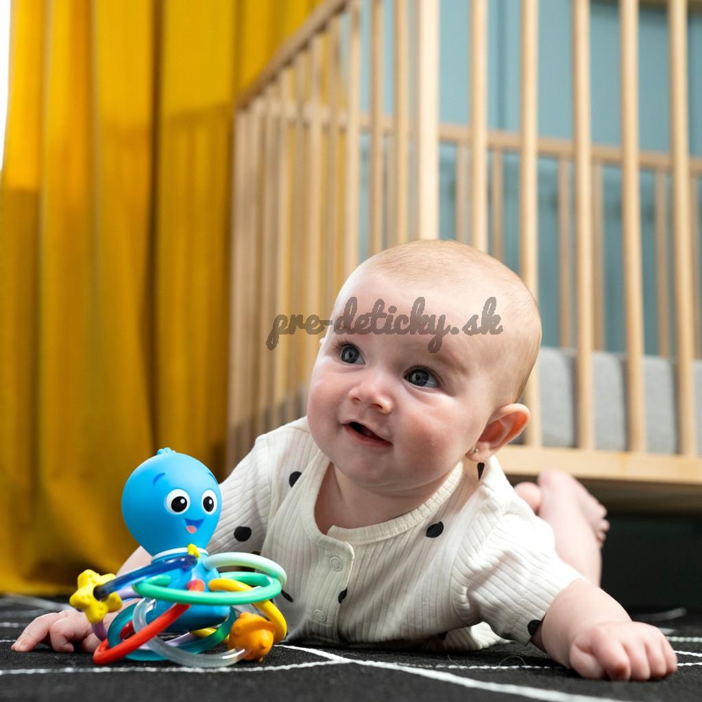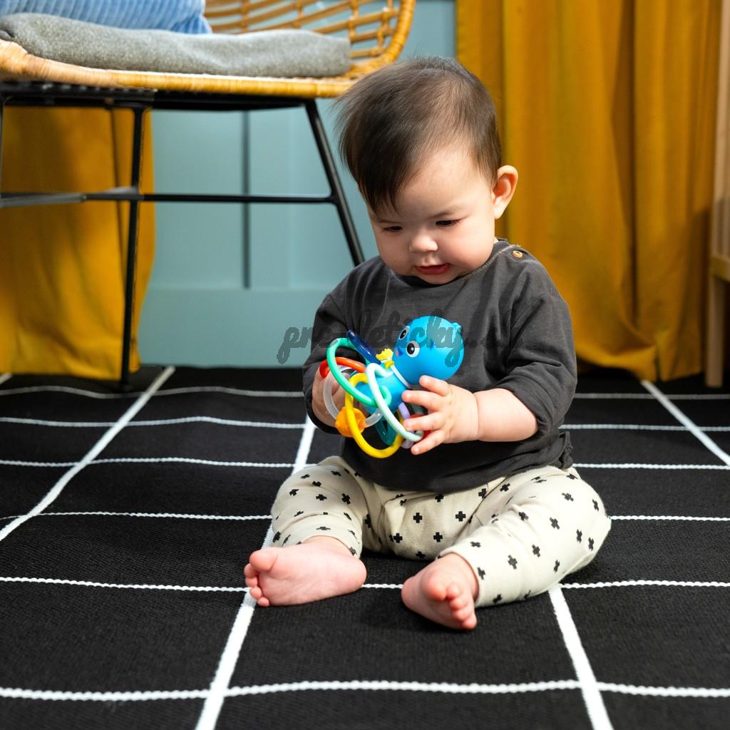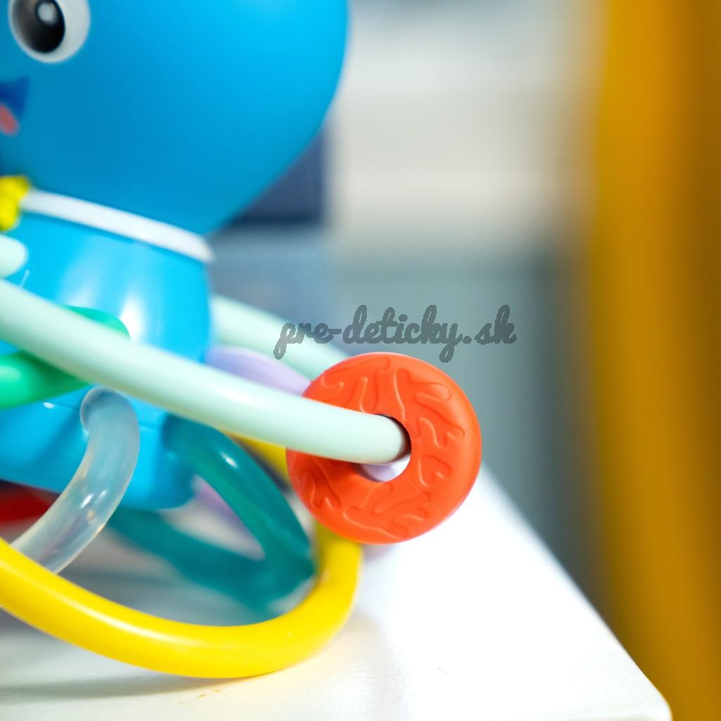 Hračka na hryzenie a hrkálka Baby Einstein Ocean Explorers pomáha upokojiť boľavé ďasná a stimulovať zmysly dieťaťa vďaka rôznym textúram, jasným farbám a skrytej hrkálke. Toto farebné hryzátko podporuje rozpoznávanie farieb a skrytá hrkálka odmeňuje zvedavosť dieťaťa pri každom zatrasení.