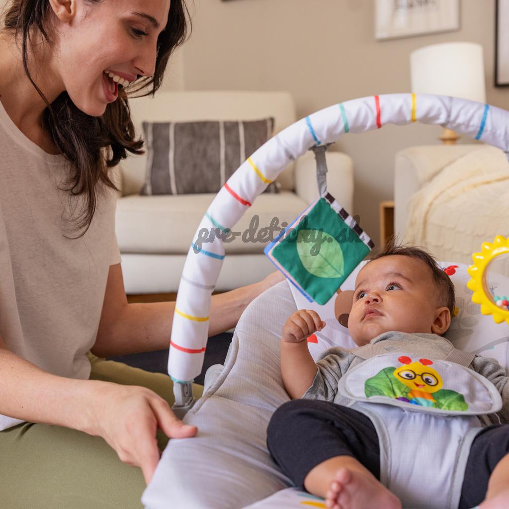 - 2 odnímateľné hračky (šuštiaca knižka a hrkálka v tvare slnka) podporujú senzorické objavovanie; odstránením hrazdičky sa zmení na hojdačku pre batoľa