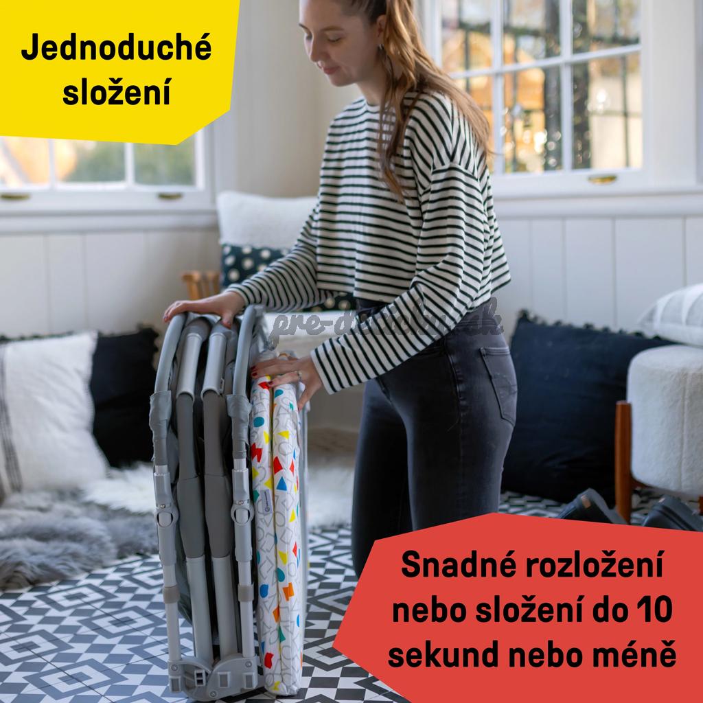 V režime Bassinet nájdete útulné miesto na odpočinok. Prepínaním klavíra do režimu Melody si užijete viac ako 25 minút upokojujúcej hudby a svetiel, ktoré nielen uspávajú, ale aj povzbudzujú k natiahnutiu sa po visiacich hračkách. Priedušné sieťované strany umožňujú vysokú viditeľnosť a prateľná plachta pre jednoduché čistenie, sú ideálne na každodenné používanie. Prepnite na režim Activity Gym odstránením matraca a hrazdičky a vychutnajte si 70+ melódií a fráz v 4 jazykoch pri hre na brušku v nastavení Discovery alebo si zahrajte hudbu v režime klavíra. Režim Playard poskytuje batoľatám priestor na hranie s oddelenými hračkami. S cestovnou taškou a jednoduchým 3-krokovým skladacím dizajnom je prenášanie naozaj hračkou.