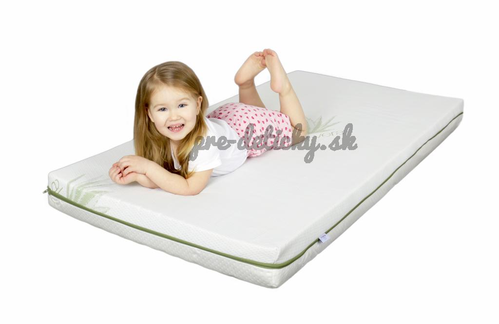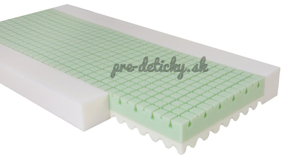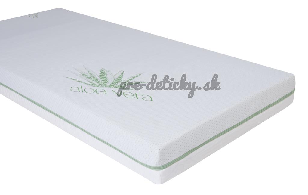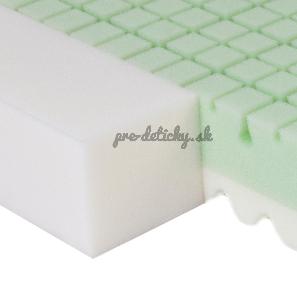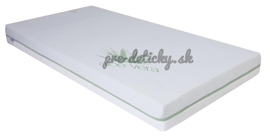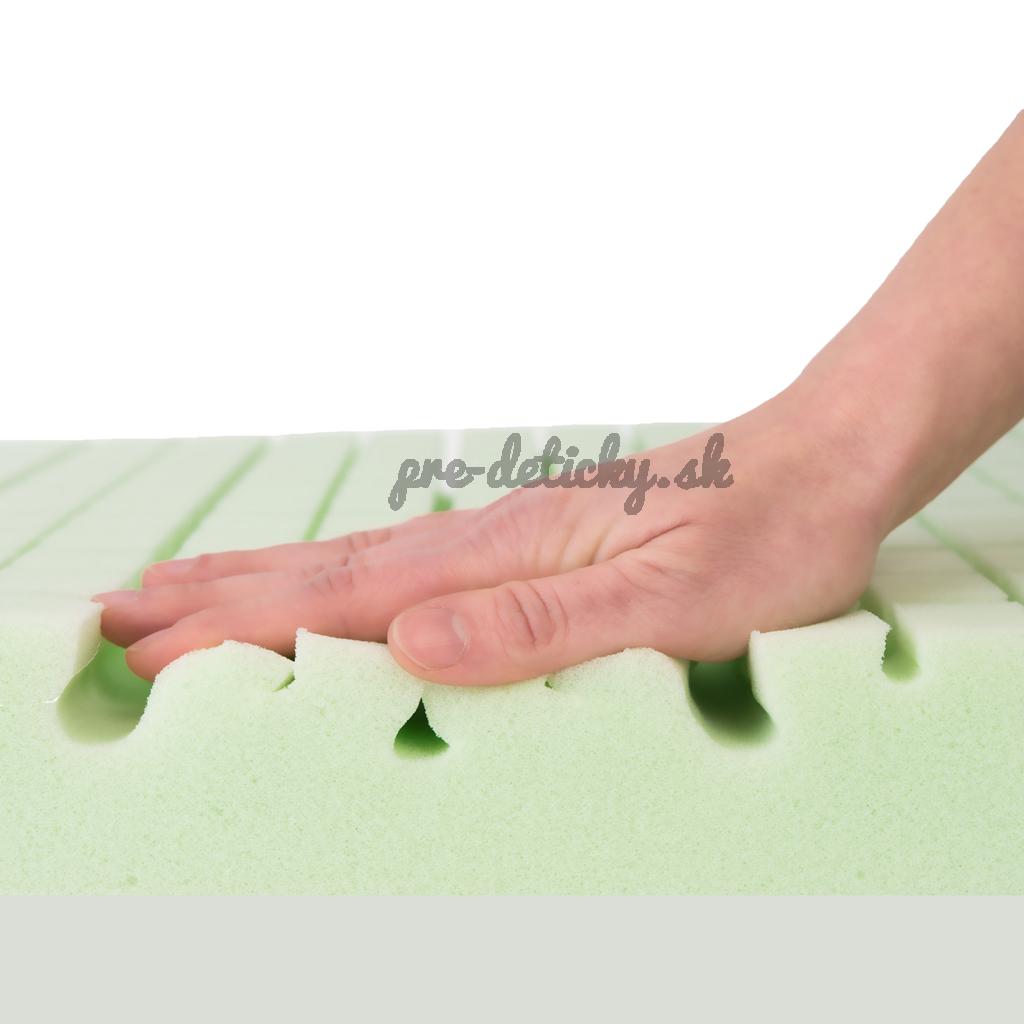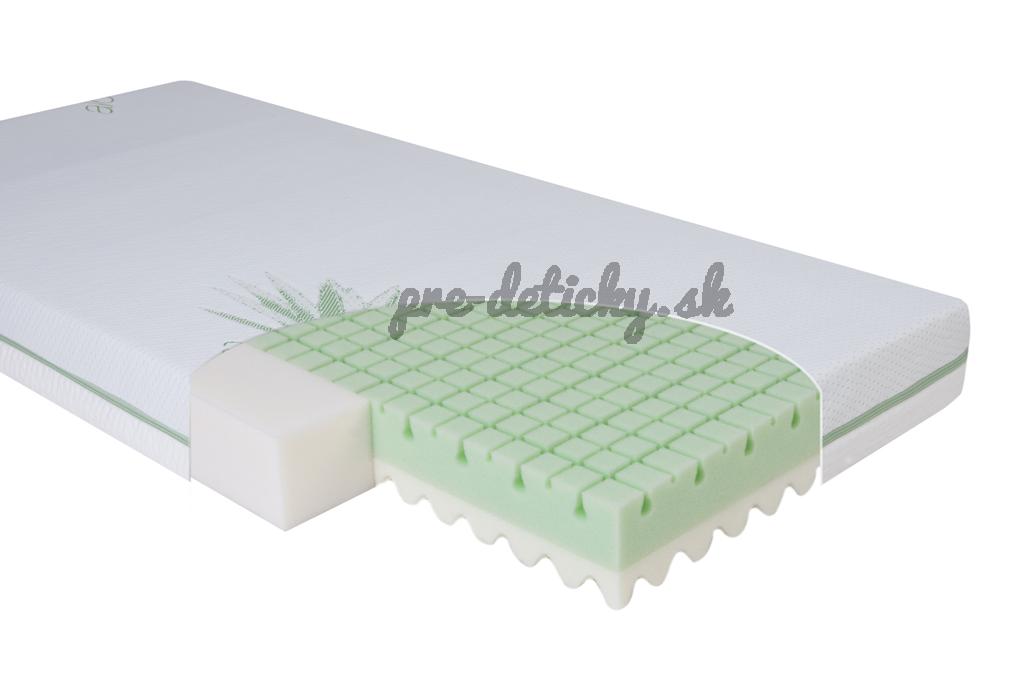 Obojstranný matrac ECO GREEN z polyuretánovej peny a pamäťovej peny má nepremokavý poťah z materiálu Tencel s Aloe Vera. Všetky použité materiály sú certifikované najvyššou bezpečnostnou triedou I. Oeko Tex a použité certifikované lepidlo na prírodnej báze, určené na kontakt s deťmi. Matrac má priečne vnútorné ventilačné kanáliky s konštrukciou "non-stop cirkulácie" s masážnymi vlastnosťami.