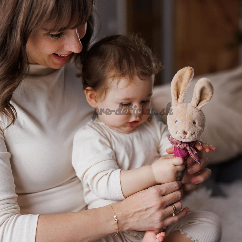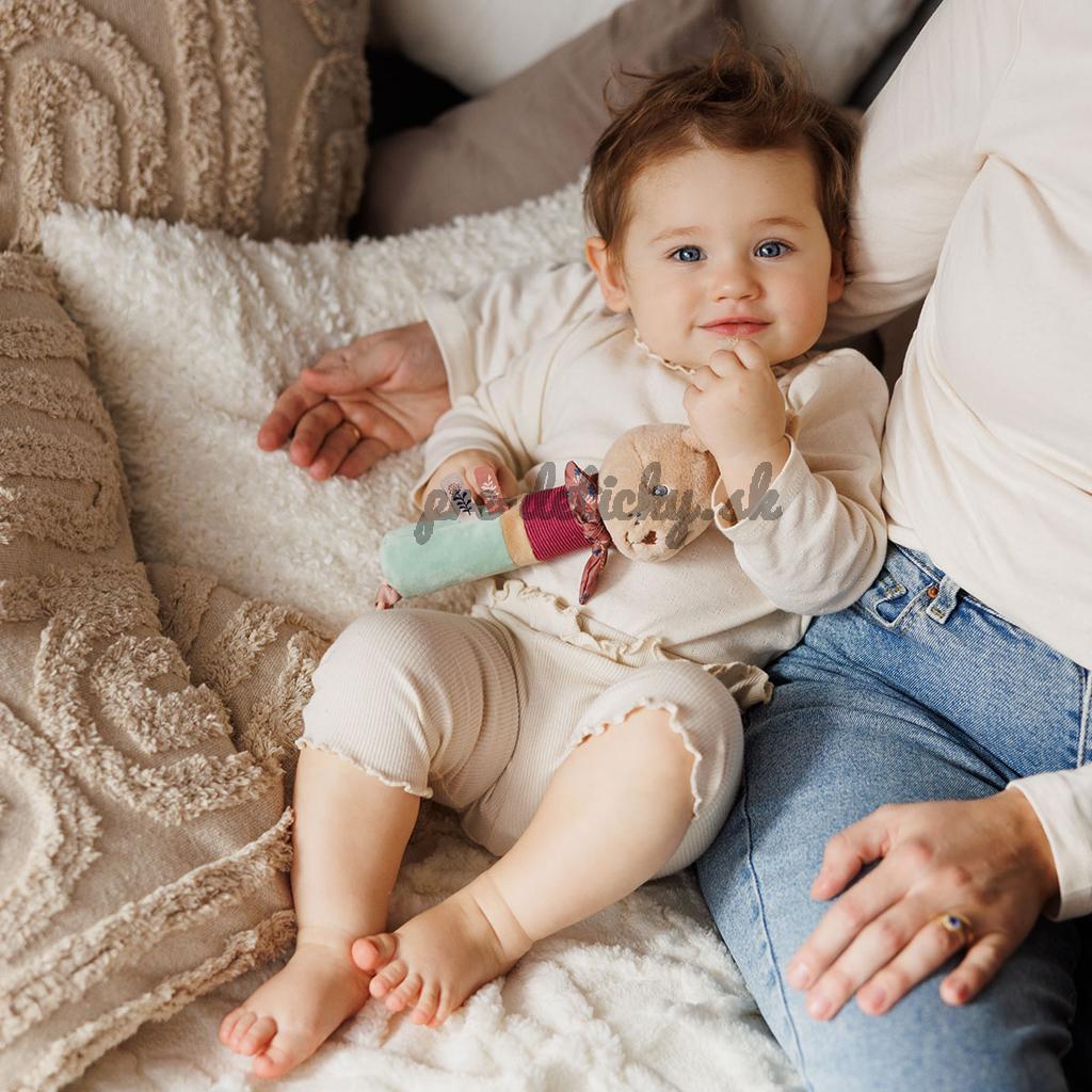 Rôzne farby stimulujú zrak, zatiaľ čo dlhé uši, uzol a stužky podporujú hmatovú spätnú väzbu. Malé ručičky môžu uchopovať a preskúmavať, čím rozvíjajú jemnú motoriku doma aj na prechádzkach.