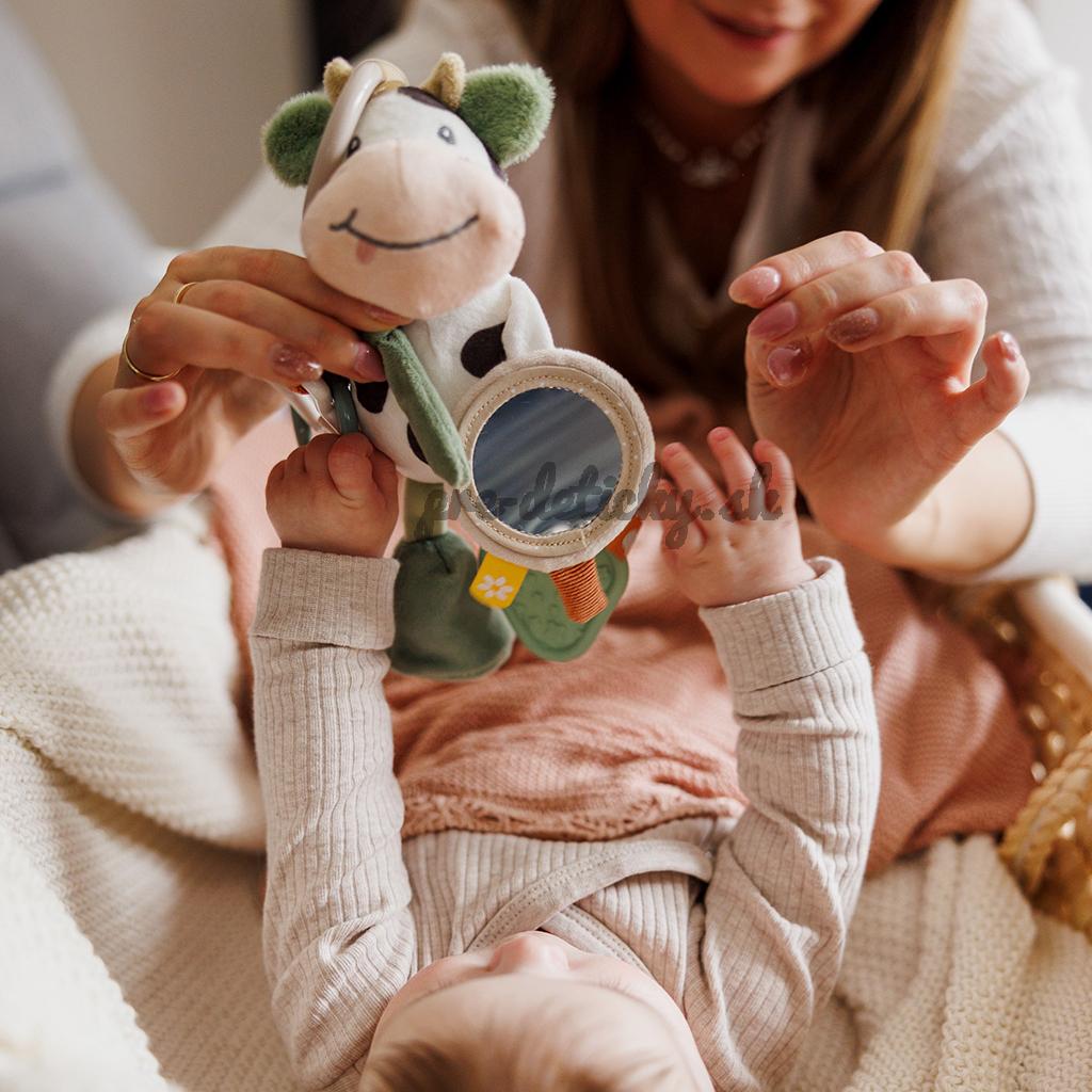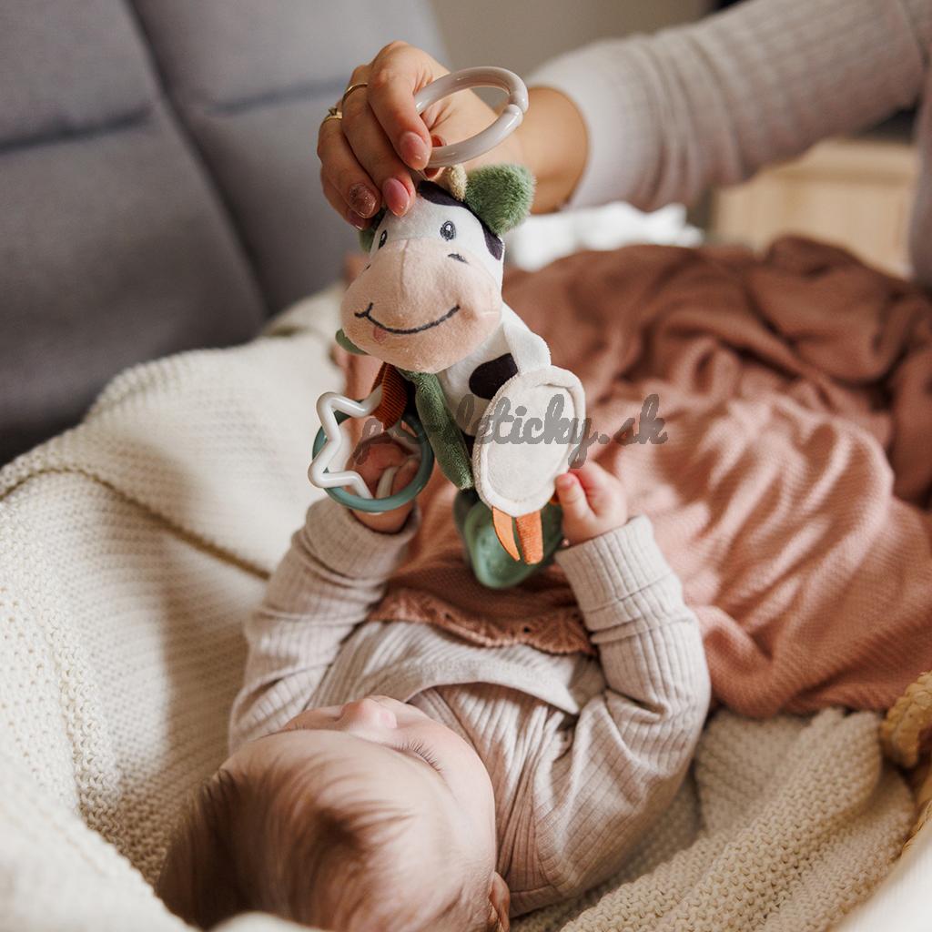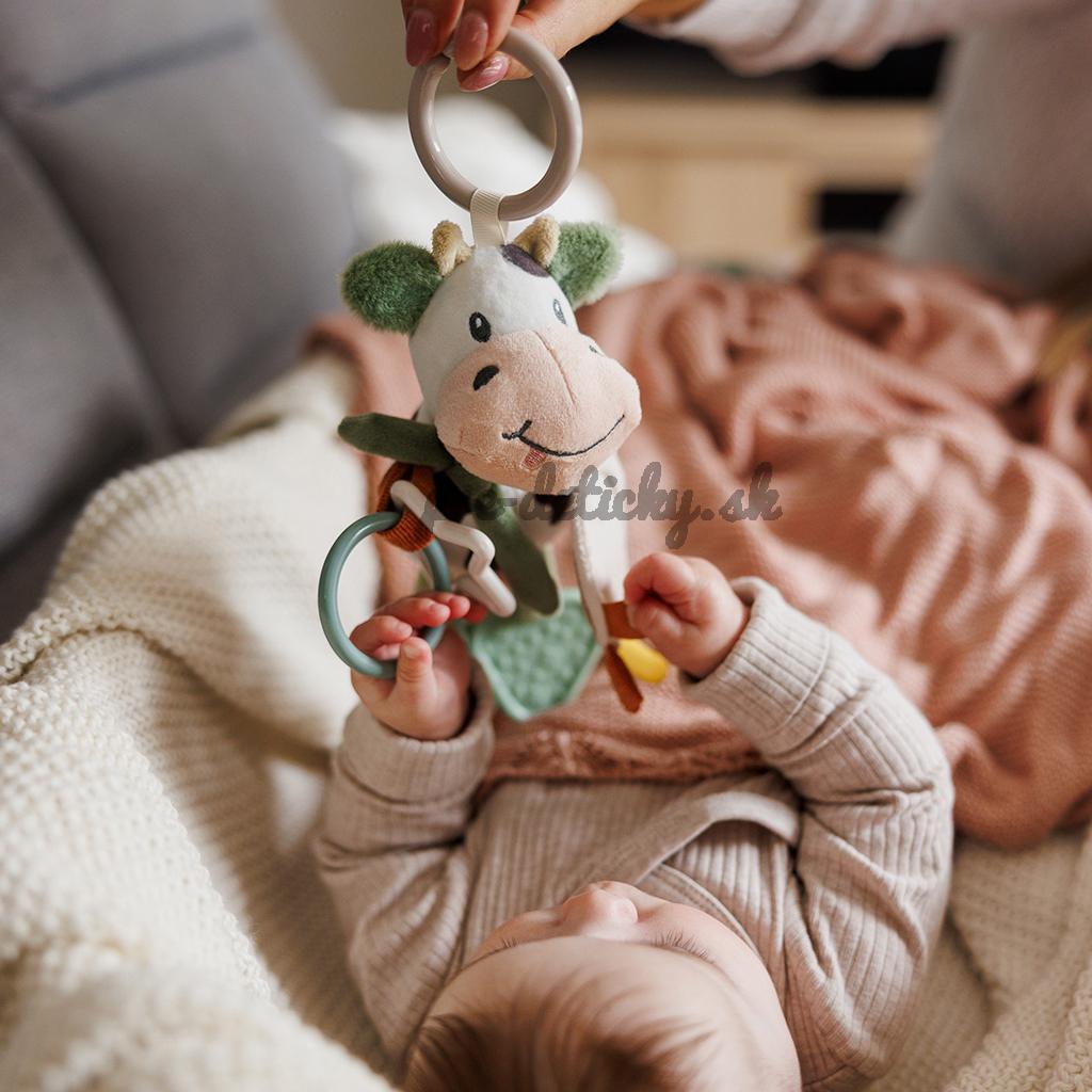 Plyšová kravička do kočíka je skvelou senzorickou hračkou pre bábätká, ktorá stimuluje ich zmysly a rozvíja jemnú motoriku. Univerzálny držiak umožňuje pripevniť prívesok na kočík, vaničku, postieľku alebo autosedačku.