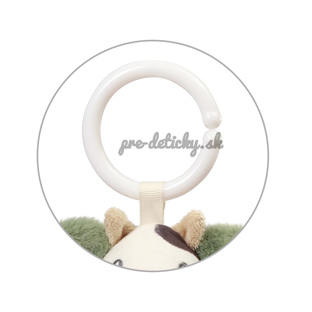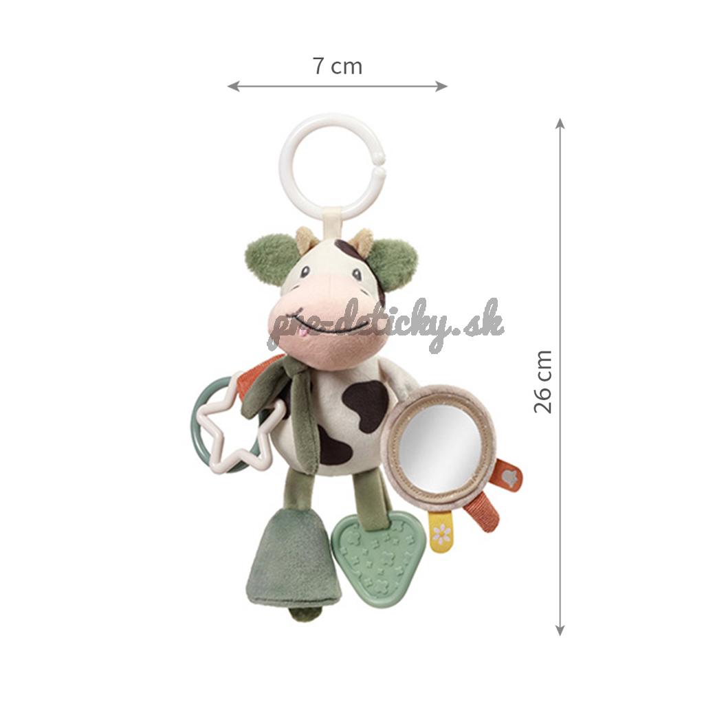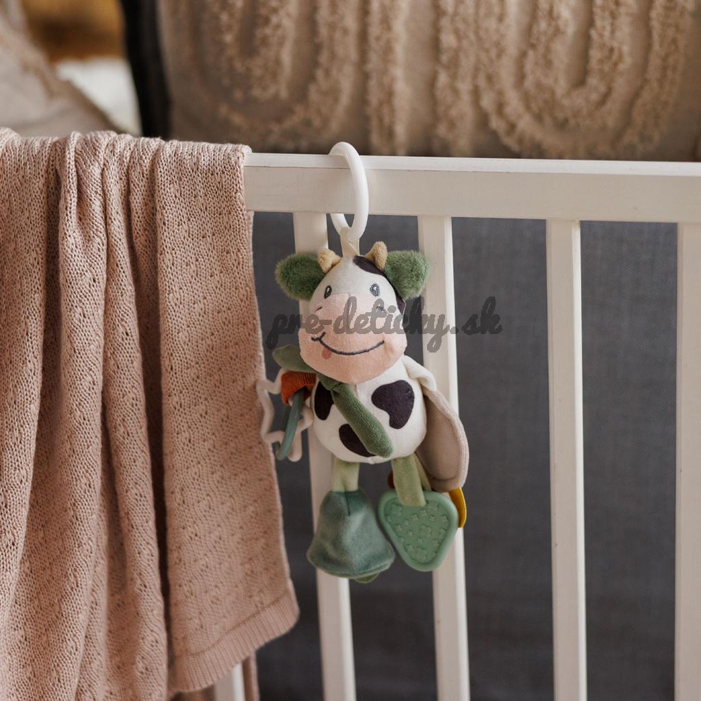 Plyšová kravička do kočíka je skvelou senzorickou hračkou pre bábätká, ktorá stimuluje ich zmysly a rozvíja jemnú motoriku. Univerzálny držiak umožňuje pripevniť prívesok na kočík, vaničku, postieľku alebo autosedačku.