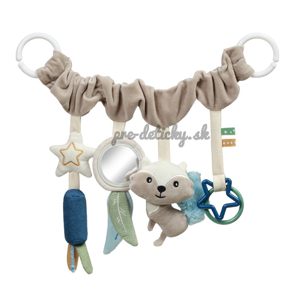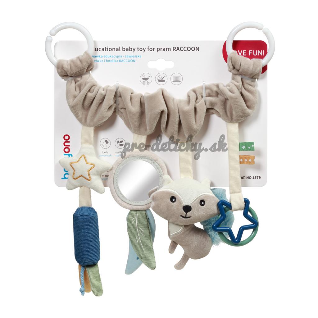 Závesná hrazdička Raccoon do kočíka a autosedačky je senzorický produkt, ktorý dokáže stimulovať hmat a zrak dieťaťa, ako aj zlepšiť jeho motorické schopnosti. Všetko, čo musíte urobiť, je pripevniť ho na kočík, kolísku alebo autosedačku, aby ste dieťa zabavili počas prechádzok a cestovania. Závesný predmet potiahnutý látkou príjemnou na dotyk je dodávaný s pôvabným medvedíkom čistotným, bezpečným zrkadielkom, príjemnými zvončekmi, ako aj s prsteňom a hviezdou. Starostlivo vybrané kúsky sú atraktívne a upútajú pozornosť dieťaťa. Váš drobec sa môže hrať, objavovať svet a rozvíjať svoje oči a sluch.