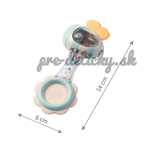- Pri trasení hrkálka vydáva jemné zvuky, ktoré priťahujú pozornosť bábätka a rozvíjajú jeho sluch.