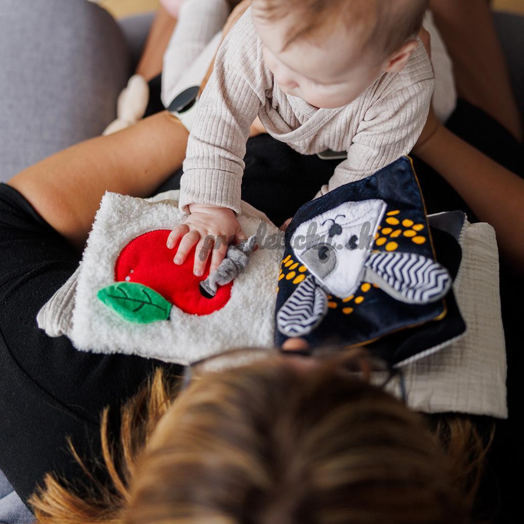 Priateľská myška v kontrastných farbách vás pozýva na hranie. Mäkká senzorická kniha pre bábätká zapája ich zmysly od prvých mesiacov života.