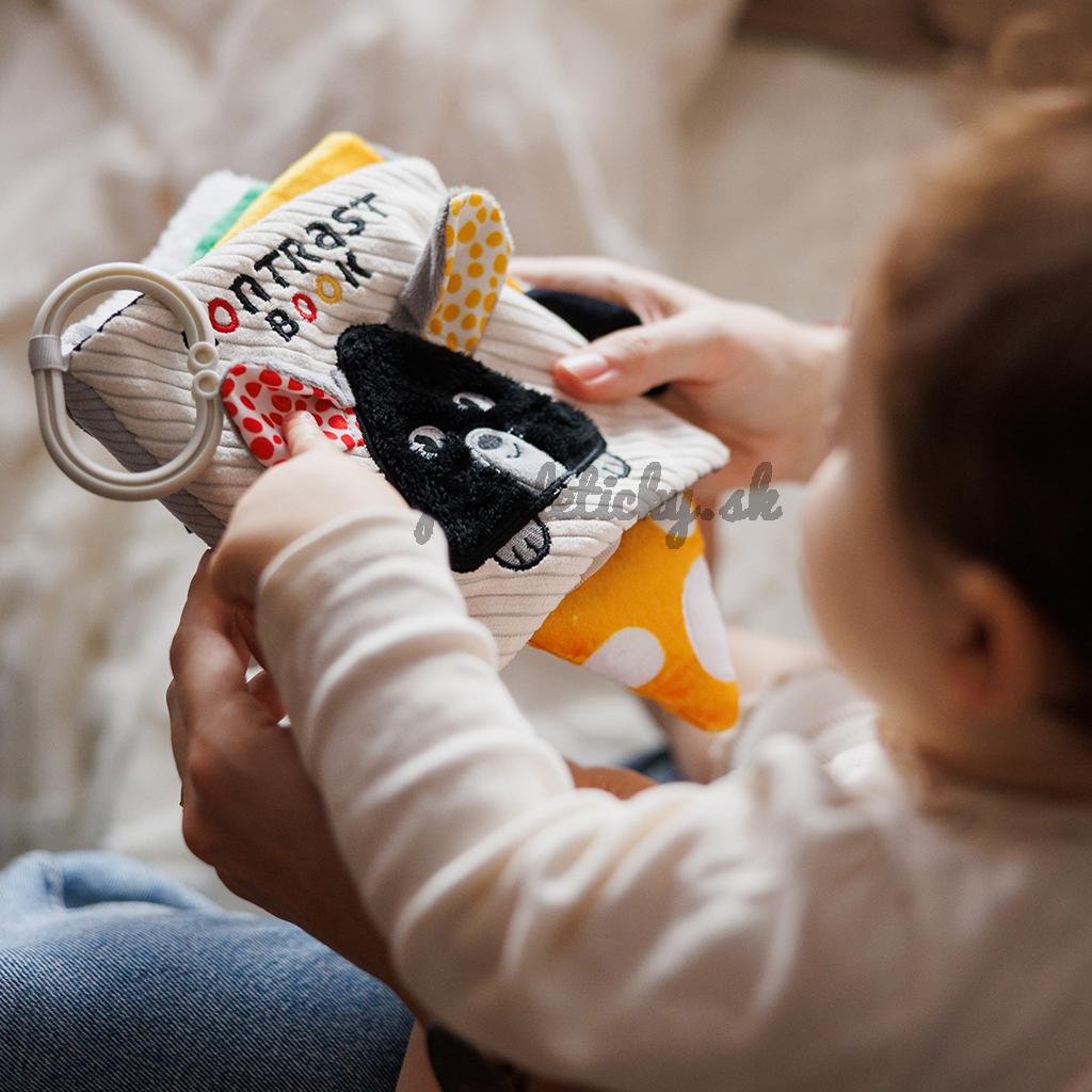 Kontrastné farby: Túto knihu s vysokým kontrastom sme navrhli s ohľadom na najmenšie deti. Čiernobiele kontrasty a červené a žlté akcenty sú prvými farbami, ktoré si bábätká všimnú. Stimulujú ich zrak od prvých mesiacov života.
