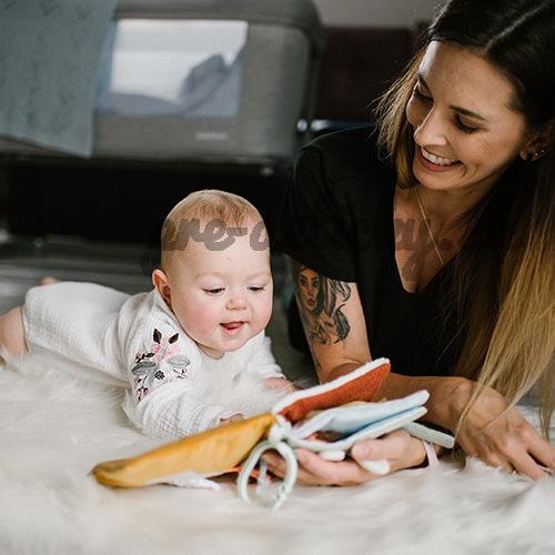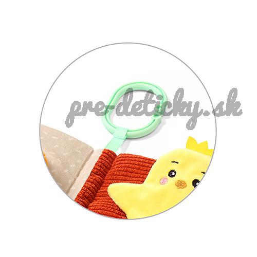 Knižka Babyono má praktický úchyt pre jednoduché pripevnenie na postieľku, kočík, autosedačku a ďalšie.