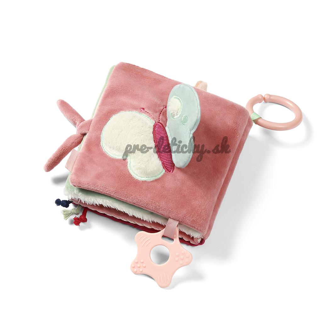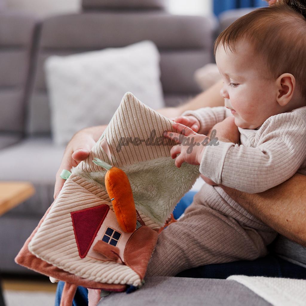 Zaujímavé textúry, rôzne farby a tvary stimulujú fantáziu. Látková kniha má C-krúžok - môžete ju zavesiť na postieľku, kočík alebo autosedačku.