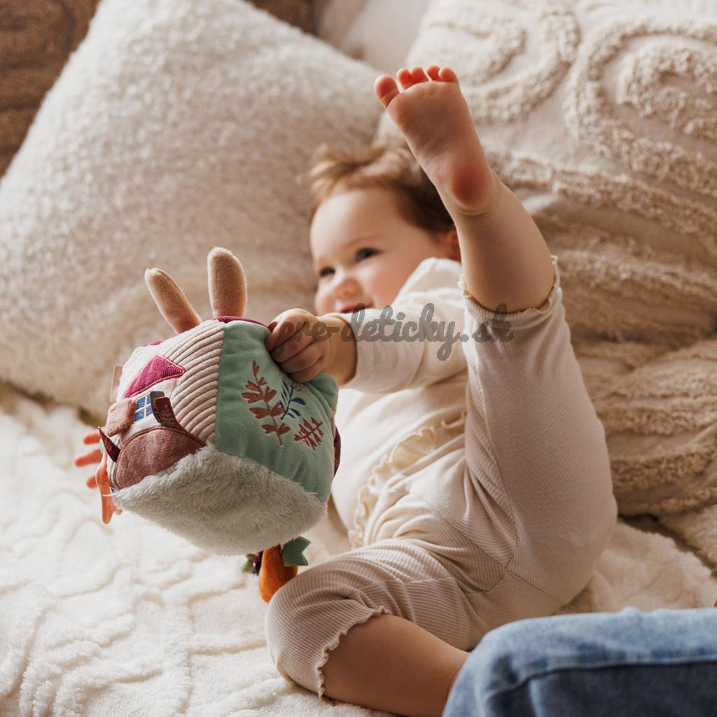 Táto aktívna kocka pre deti sa vyznačuje šuštivým zvukom a jemnou hrkálkou, ktoré stimulujú sluch. Vyčnievajúce stužky a povrázky povzbudzujú k uchopeniu, zatiaľ čo bezpečné zrkadlo ich povzbudzuje k objavovaniu vlastného odrazu. Mäkké hryzátko jemne masíruje ďasná.