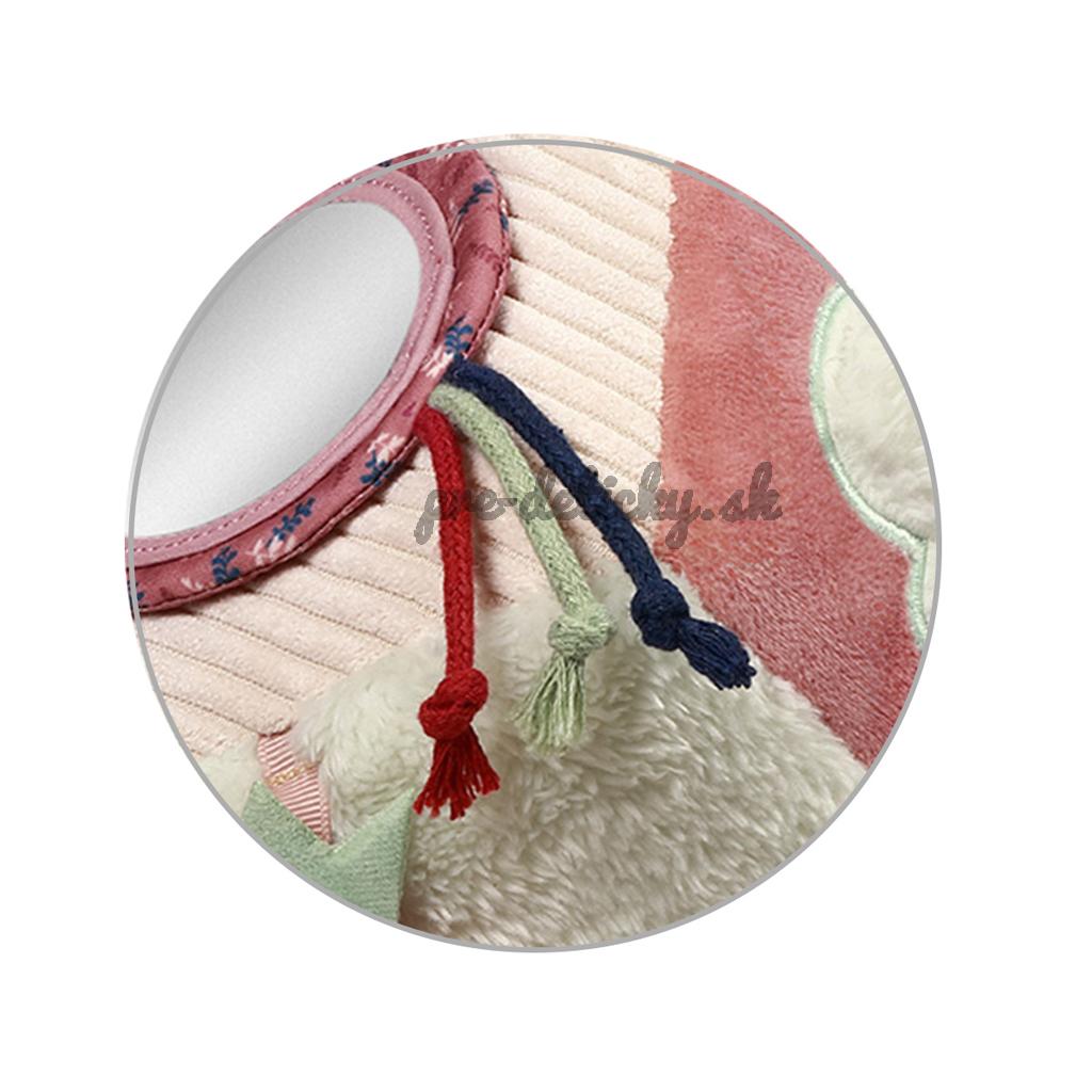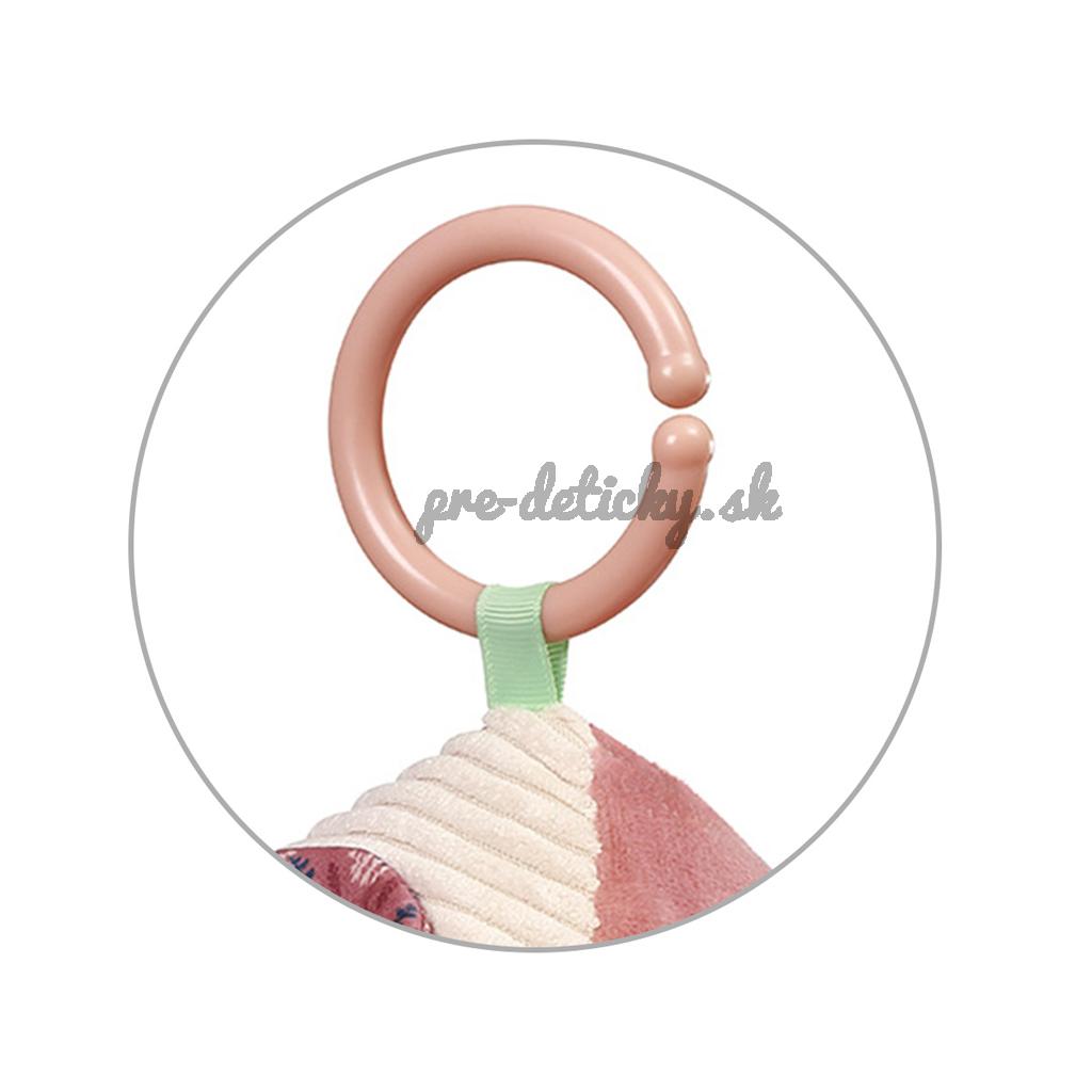 Univerzálny krúžok umožňuje zavesenie na postieľku, kočík alebo autosedačku. Zaujímavé textúry stimulujú hmat a rozmanité farby a tvary priťahujú pozornosť.