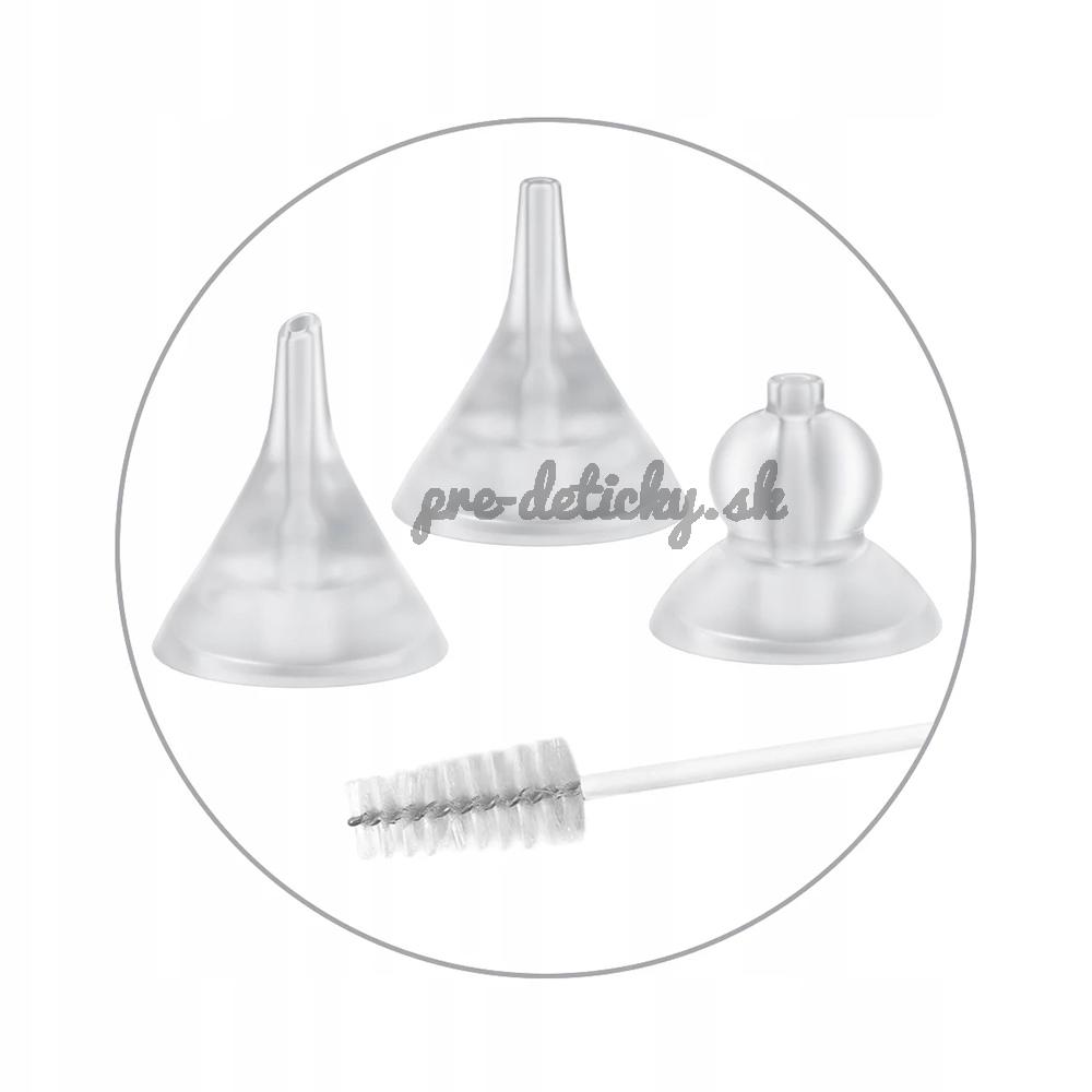 3 Mäkké silikónové nadstavce Ultra mäkké 3 silikónové nadstavce, ktoré možno prispôsobiť typu sekrétov a veku dieťatka. Obsahuje aj prídavnú čistiacu kefku. Zaručene hygienické a prispôsobené potrebám tých najmenších.