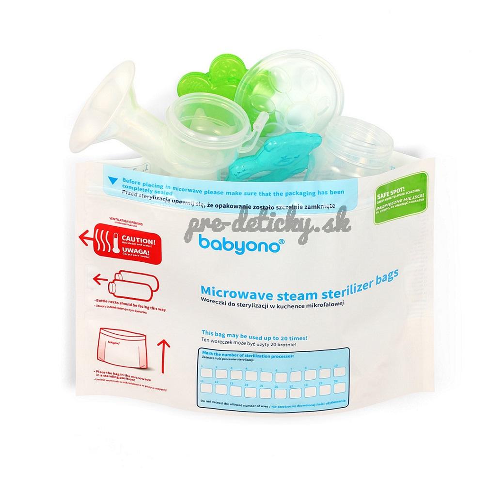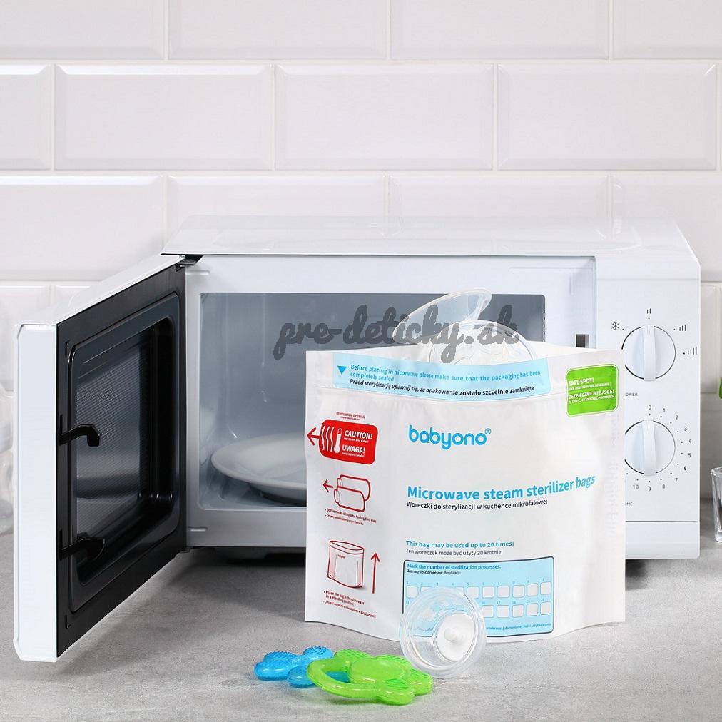 Sterilizačné vrecká do mikrovlnnej rúry sú jednoduchým, rýchlym a bezpečným spôsobom sterilizácie fliaš, cumlíkov, ochrán bradaviek a ďalších výrobkov pre dojčatá. Je to výrobok nahrádzajúci tradičný sterilizátor. Sterilizácia trvá iba 1,5 minúty a prebieha v troch jednoduchých fázach. Vodná para, ktorá sa v sáčku vytvára počas sterilizačného procesu, likviduje až 99,9% baktérií a choroboplodných zárodkov. Každé vrecko možno použiť až 20 krát. Výrobok je vyrobený z trvanlivých a bezpečných materiálov, úplne bez obsahu bisfenolu A, je bezpečný, spoľahlivý a funkčný.