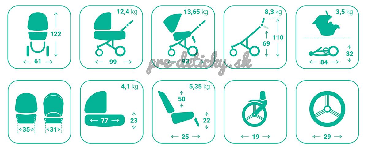 Okrem základného príslušenstva, ako je držiak na pohár, pláštenka alebo moskytiéra, súprava obsahuje aj funkčný držiak telefónu, ktorý je možné zavesiť na rám. Súčasťou sady sú aj poťahy na rám a čalúnenie, ktoré poskytujú výbornú ochranu pred poškriabaním pri preprave a skladovaní kočíka. Rozmery: