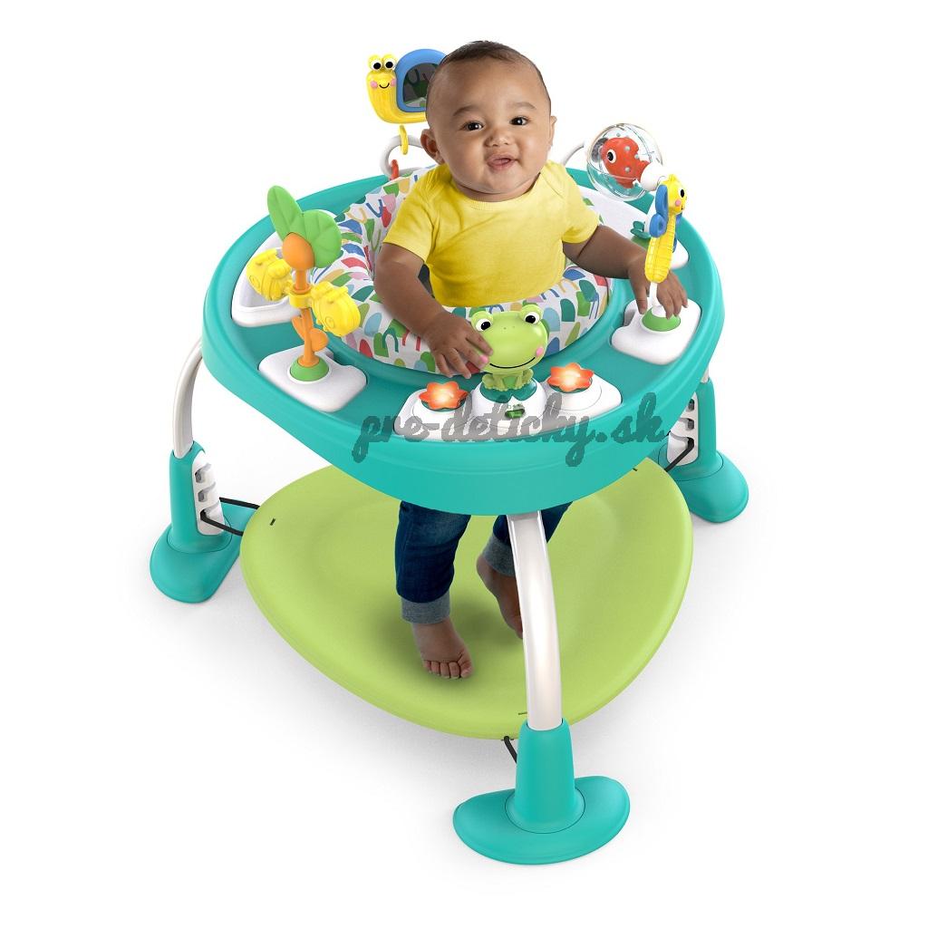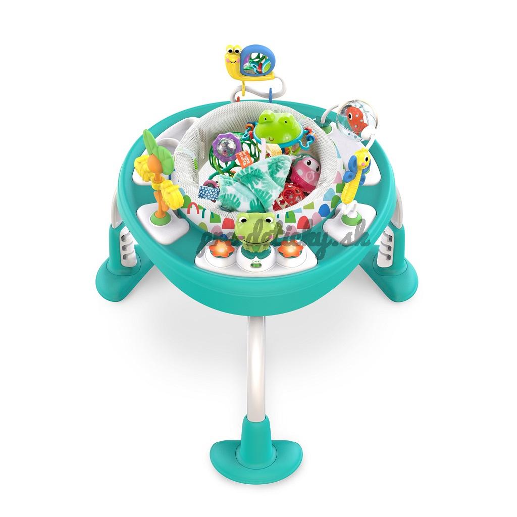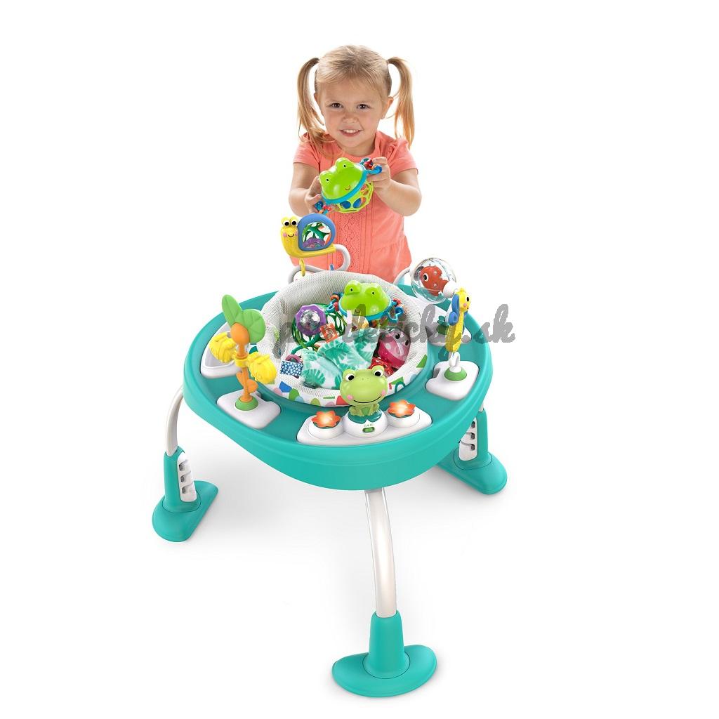 Zo sedadla a skákadla sa postupne stane stolík na hranie s aktivitami pre batoľatá aj so sieťkou na odkladanie hračiek. Aby si dieťatko mohlo oprieť nožičky alebo skákať od radosti v správnej výške je možné nastaviť výšku pružnej podložky na nohy do 3 rôznych polôh, podľa potreby dieťatka. Sedadlo skákadla sa otáča o 360 ° pre ľahký prístup ku všetkým hračkám a činnostiam. Interaktívna žabka vydáva hravé zvuky, prehráva hudbu a svieti, čo aktivuje viaceré zmysly vášho dieťatka.