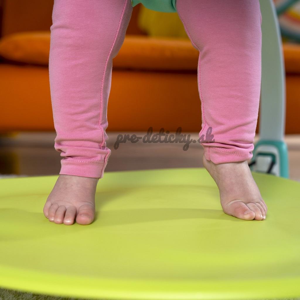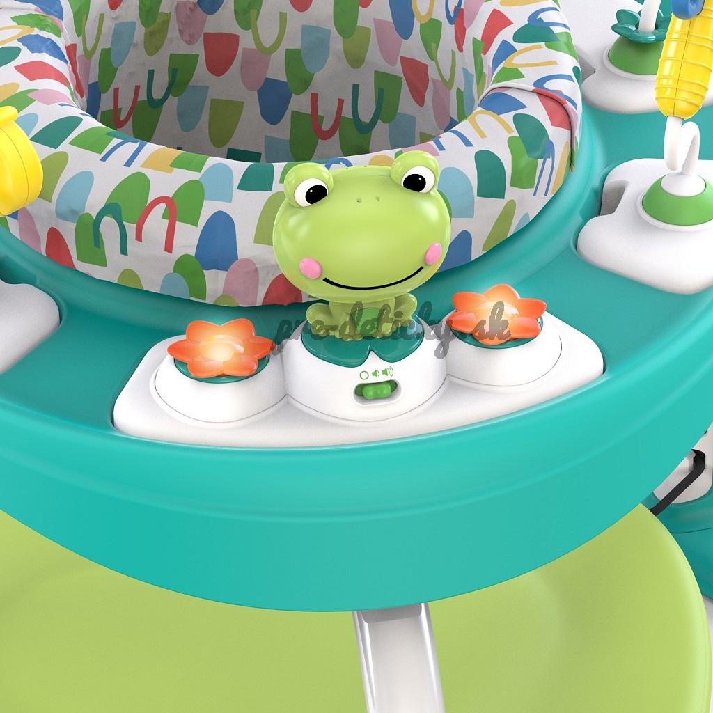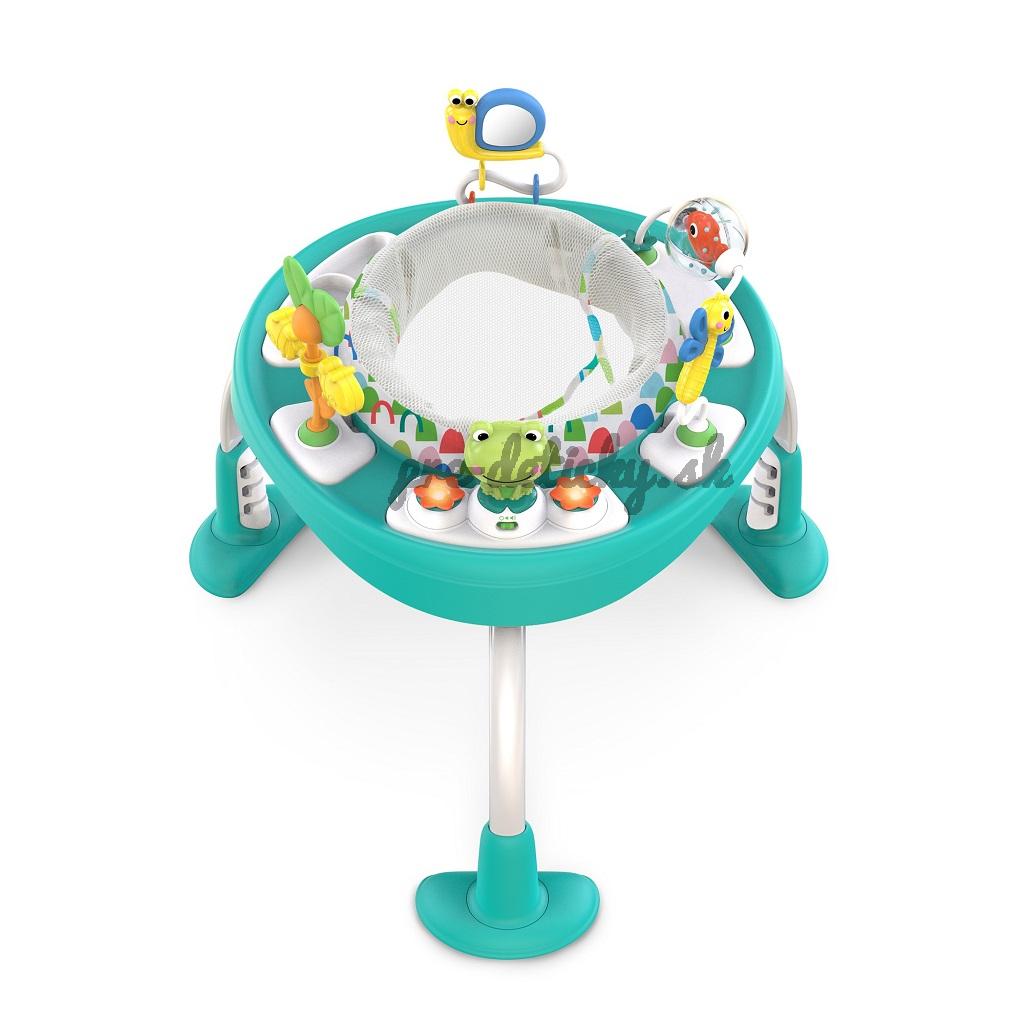 Zo sedadla a skákadla sa postupne stane stolík na hranie s aktivitami pre batoľatá aj so sieťkou na odkladanie hračiek. Aby si dieťatko mohlo oprieť nožičky alebo skákať od radosti v správnej výške je možné nastaviť výšku pružnej podložky na nohy do 3 rôznych polôh, podľa potreby dieťatka. Sedadlo skákadla sa otáča o 360 ° pre ľahký prístup ku všetkým hračkám a činnostiam. Interaktívna žabka vydáva hravé zvuky, prehráva hudbu a svieti, čo aktivuje viaceré zmysly vášho dieťatka.