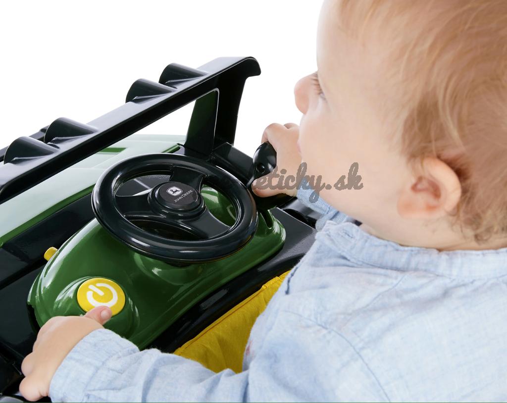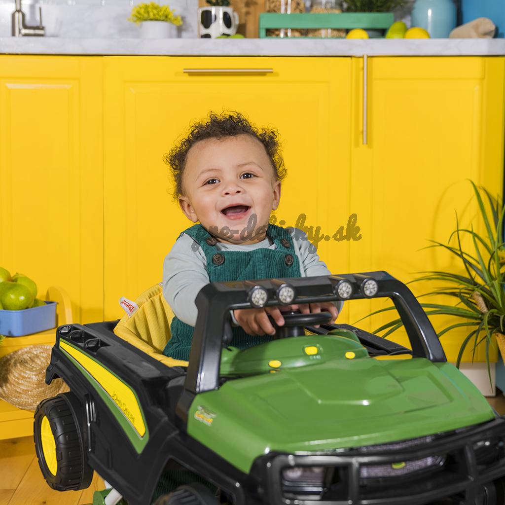 Vysoké operadlo sedadla poskytuje dieťaťu pohodlie a oporu. Pre ešte väčšiu zábavu možno odpojiť hraciu stanicu s volantom a dieťa sa môže hrať posediačky alebo aj na cestách. V ktoromkoľvek z 4 režimov si dieťa užije imaginárnu jazdu s realistickými zvukmi John Deere Gator, svetlami, radiacou pákou, volantom a dizajnom skutočného terénneho vozidla.