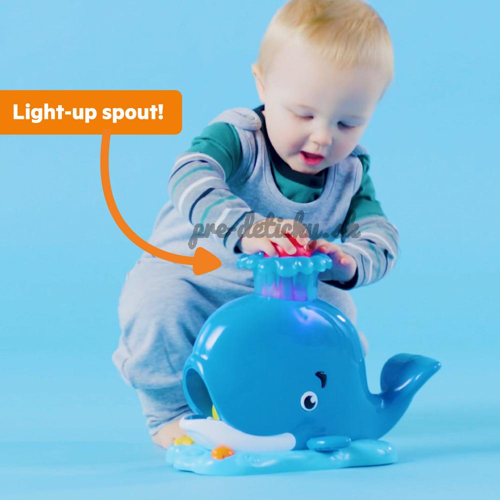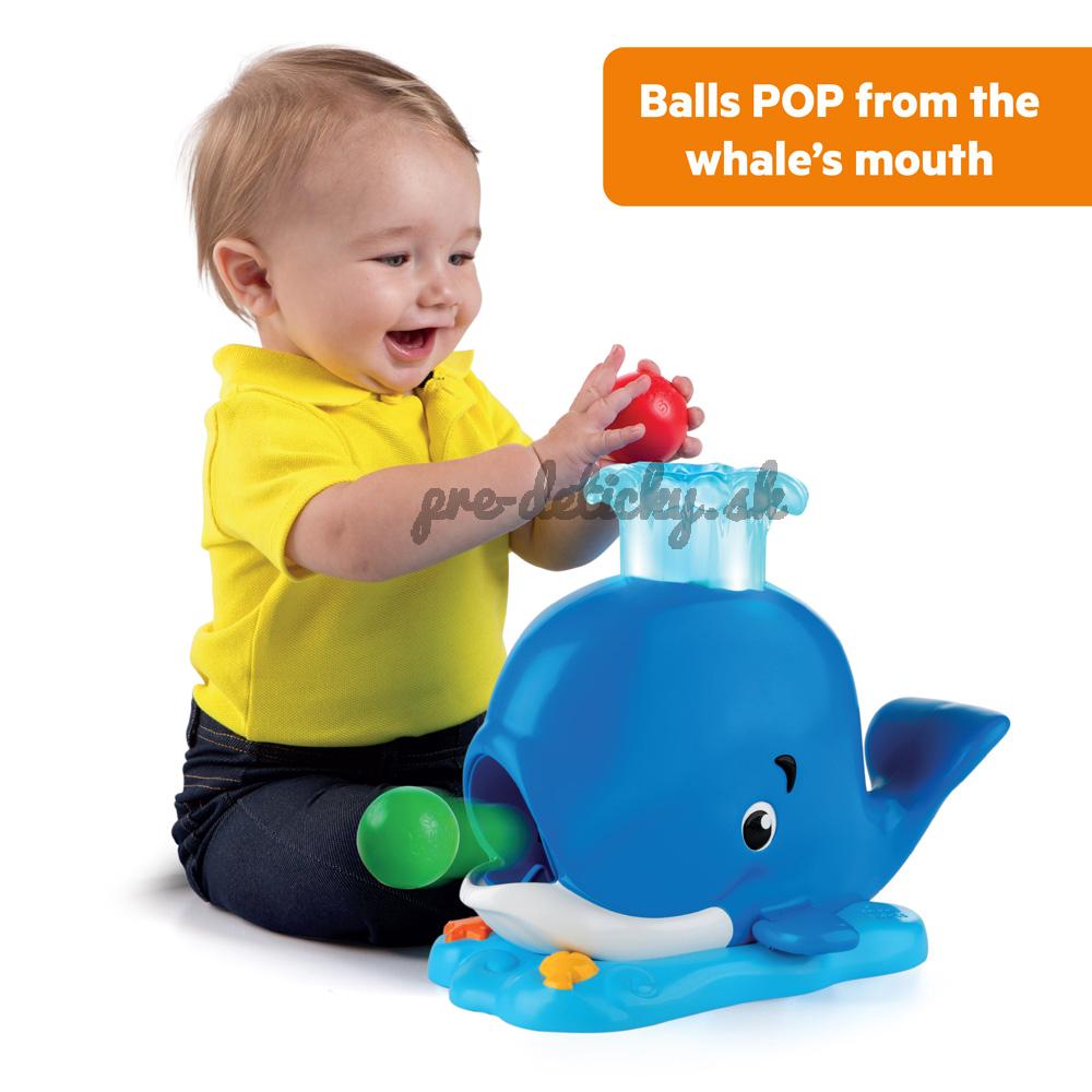 Stačí vložiť loptičky do otvoru na hlave veľryby, zatlačiť a zábava sa môže začať. Rozsvietia sa zábavné svetlá a zvuky, loptičky vyskakujú z úst veľryby, čím podporujú opakované hranie a pohyb dieťatka. Deti milujú naháňanie loptičiek a nekonečná zábava je tu. Súčasťou balenia sú 3 farebné loptičky.