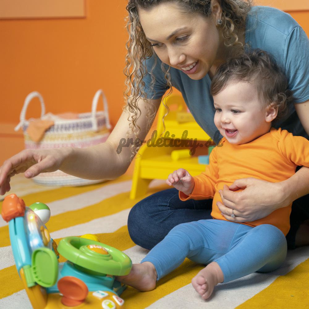 Šliapnite na pedál... dieťa je na ceste za zábavou! Vďaka skutočným zvukom auta, radeniu rýchlostných stupňov a volantu, ktorým sa dá otáčať a krútiť, sa vaše dieťatko chystá na jazdu svojho života. Zapnite si melódie na autorádiu, nastavte zrkadlo a otočte smerovkami a vydajte sa na cestu podľa fantázie vášho dieťaťa. Meňte rýchlostné stupne, aby ste naučili svojho malého vodiča poznávať čísla a tvary, kde stláčaním tlačidiel sa hračka rozsvieti.