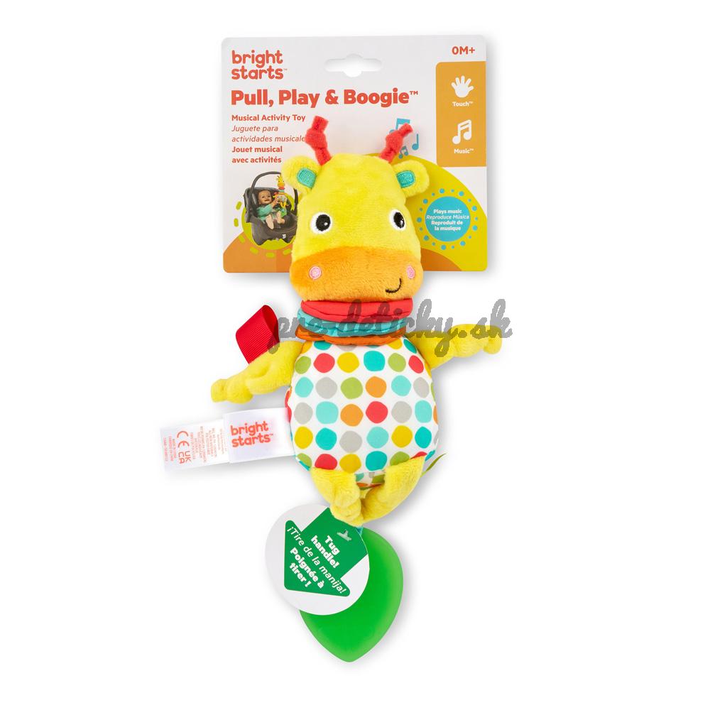 Hračka Bright Starts Pull, Play & Boogie prinesie radosť vám aj dieťaťu, ktoré sa učí a hrá naraz! Jemné potiahnutie za list spôsobí, že sa žirafí kamarát začne naťahovať. Sledujte, ako sa jej telo rozťahuje a pomaly sťahuje v rytme 60-sekundových veselých melódií. S touto hudobnou naťahovacou hračkou podporíte rozvoj jemnej motoriky, vizuálneho zapojenia a príčin a následkov. Dieťatko si zamiluje mäkkú rozmanitosť látok, ktoré umožňujú hmatové skúmanie, pestré farby žirafy a doplnkov a chichotanie, ktoré táto hračka prináša!