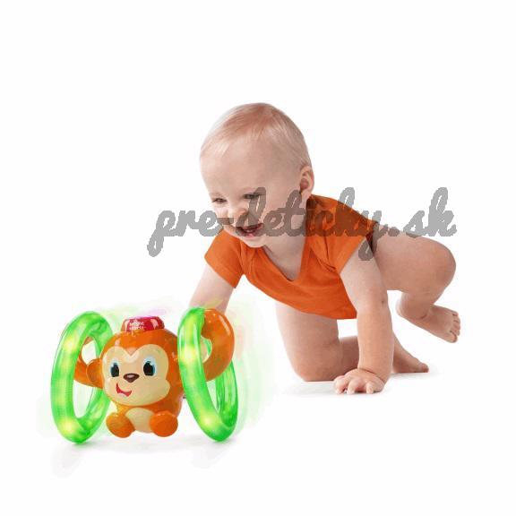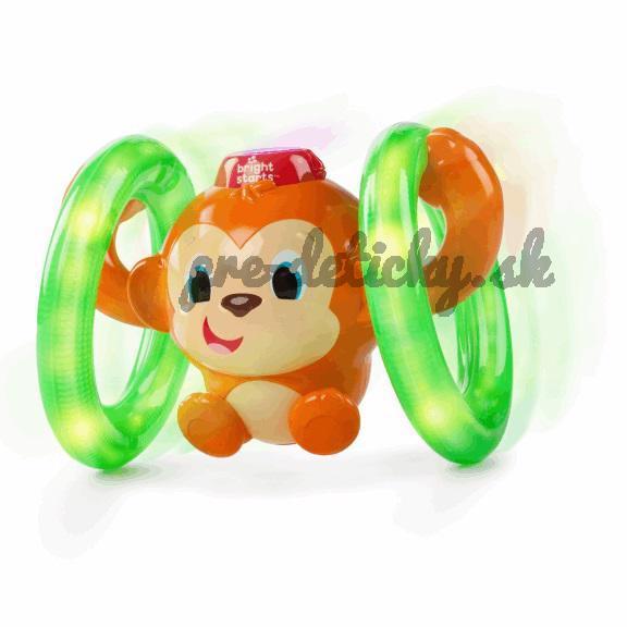 Aktívna hračka opička od Bright Starts™ Roll & Glow svieti, hrá a pohybuje sa na kolieskach. Stlačením tlačidla na klobúku môže opičia zábava začať. Kolieska opičky sa rozsvietia a začnú sa točiť.