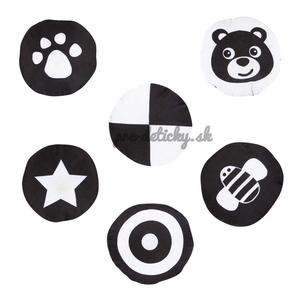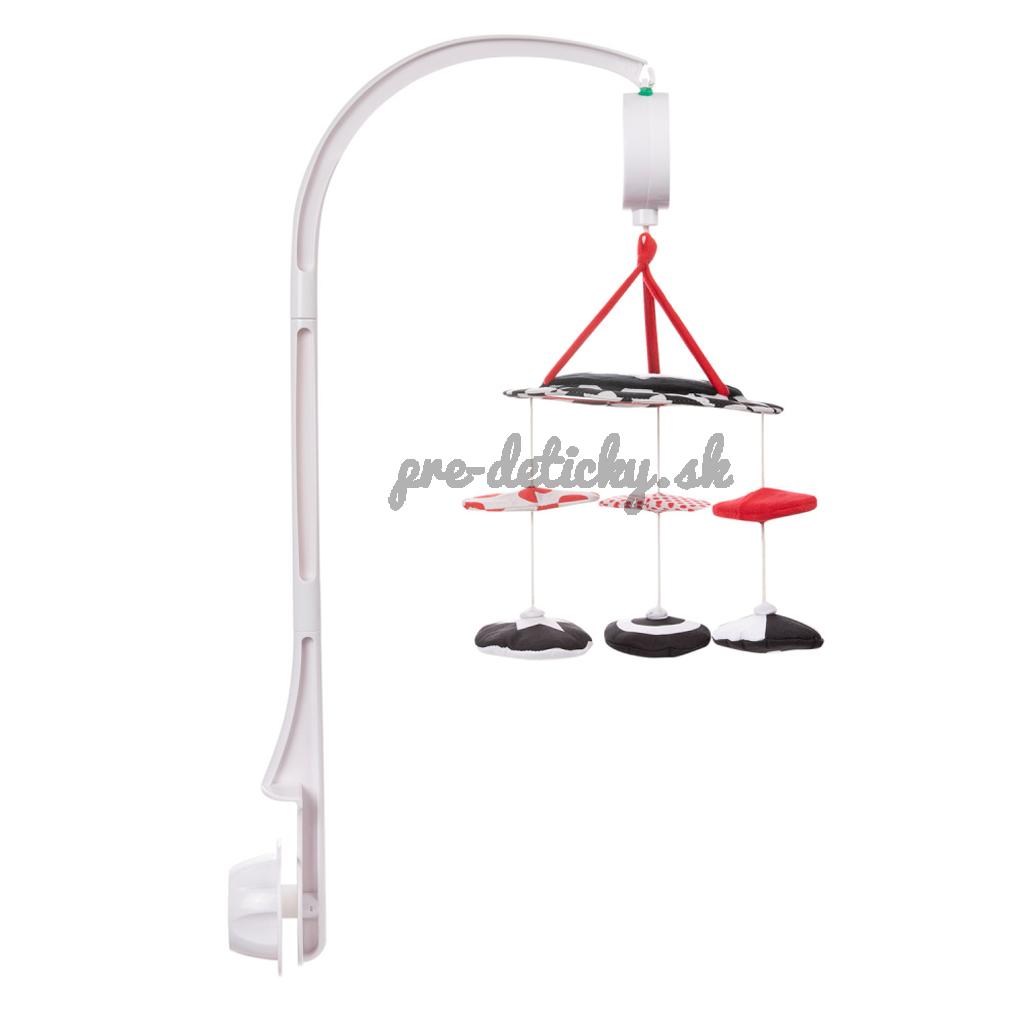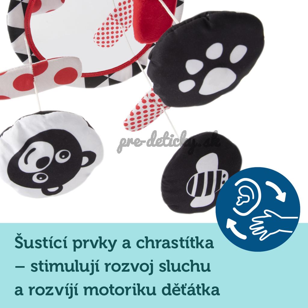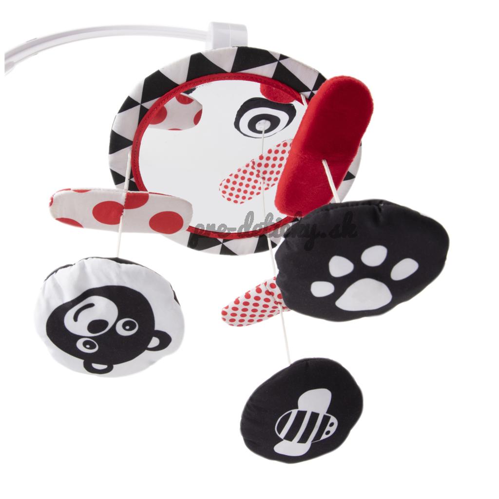 - Kontrastný plyšový kolotoč s melódiami SENSORY je farebne vyhotovený v červenej, čiernej a bielej farbe.