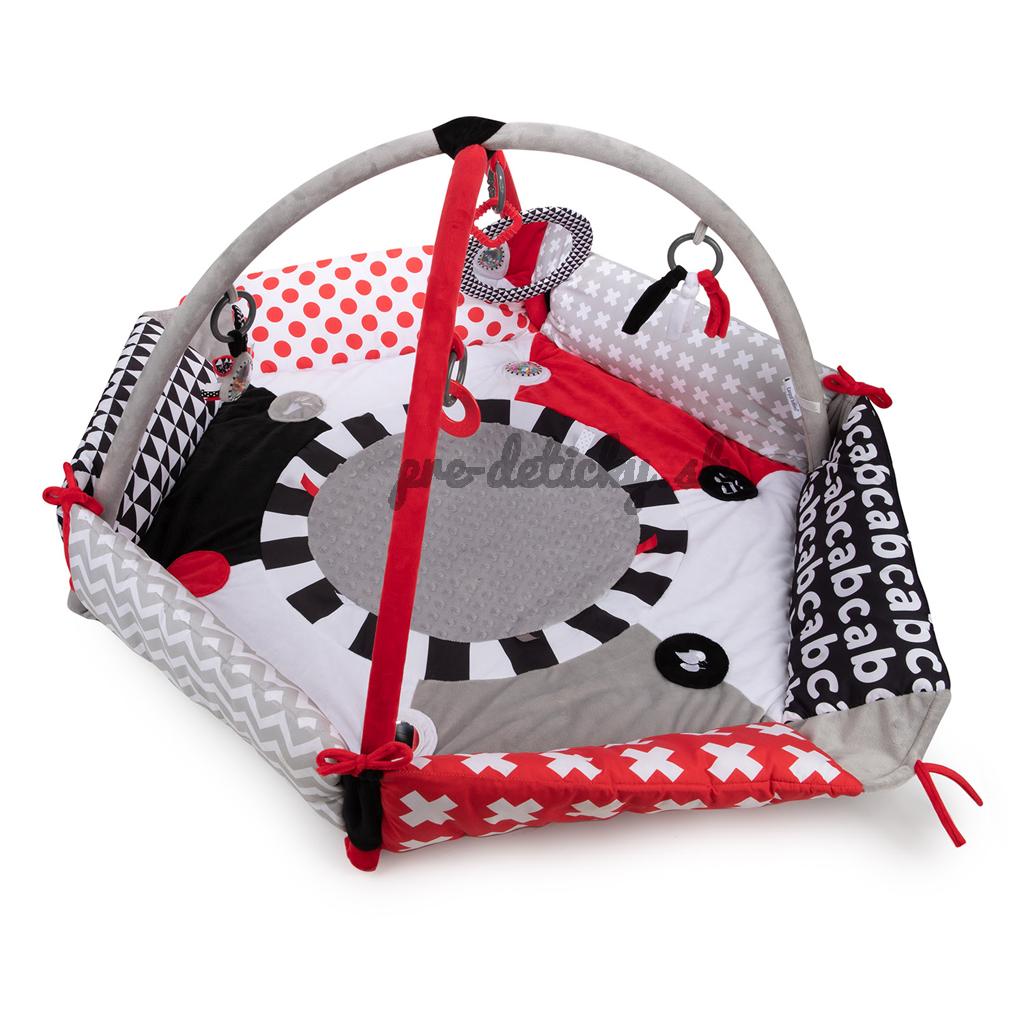 Kontrastná hracia deka z kolekcie SENSORY je ideálnym pomocníkom pre prvý rok života bábätka. Disponuje interaktívnymi prvkami, ktoré zaujmú dieťa na naozaj dlhú dobu, podnecujú jeho aktivitu a prispievajú k rozvoju jeho zmyslov. Edukatívna deka je ideálna už pre novorodencov, pretože hneď po narodení vidia iba kontrasty. Je extra silná a našuchorená, vďaka čomu izoluje dieťa od chladnej podlahy. Hracia deka potom vyrastá spolu s dieťaťom a môže byť použitá ako ohrádka alebo ako klasická hracia podložka s hračkami na hrazdičke. Obsahuje 5 odnímateľných hračiek: hrkálku, hryzátko, zrkadielko, farebnú šnúrku a pískací/šuštiaci prvok. Všetky prvky možno od hrazdičky odopnúť a môžu potom slúžiť samostatne, len tak na hranie alebo na upútanie pozornosti bábätka.