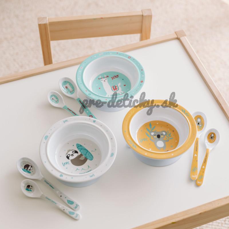 Súprava lyžíc na kŕmenie EXOTIC ANIMALS. Z melamínu, ktorý je odolný voči poškriabaniu. Zaoblené tvary nedráždia jemné ďasná dieťaťa. Lyžice majú farebné potlače, ktoré budú pre dieťa ďalším lákadlom počas jedenia. Súprava obsahuje dve lyžice: malú a veľkú. Vhodné pre deti staršie ako 9 mesiacov.