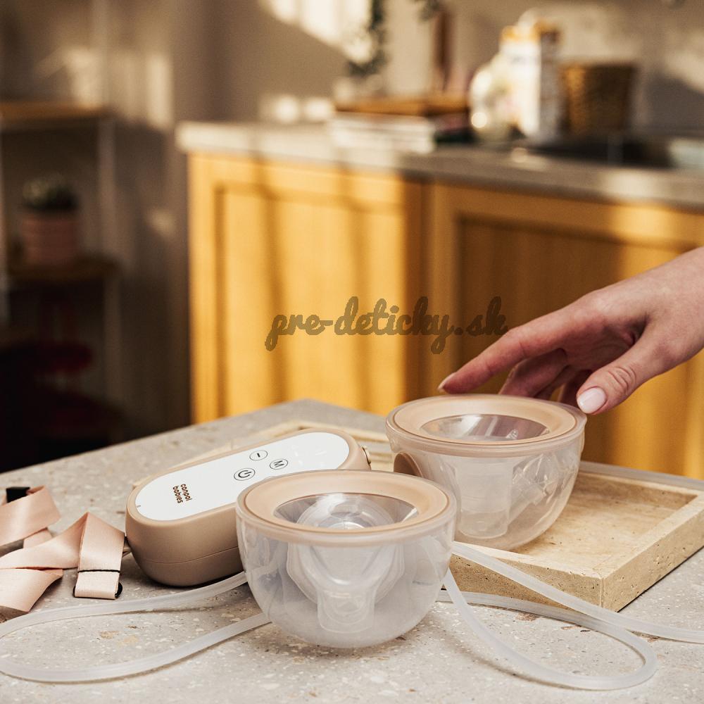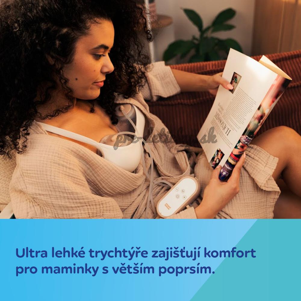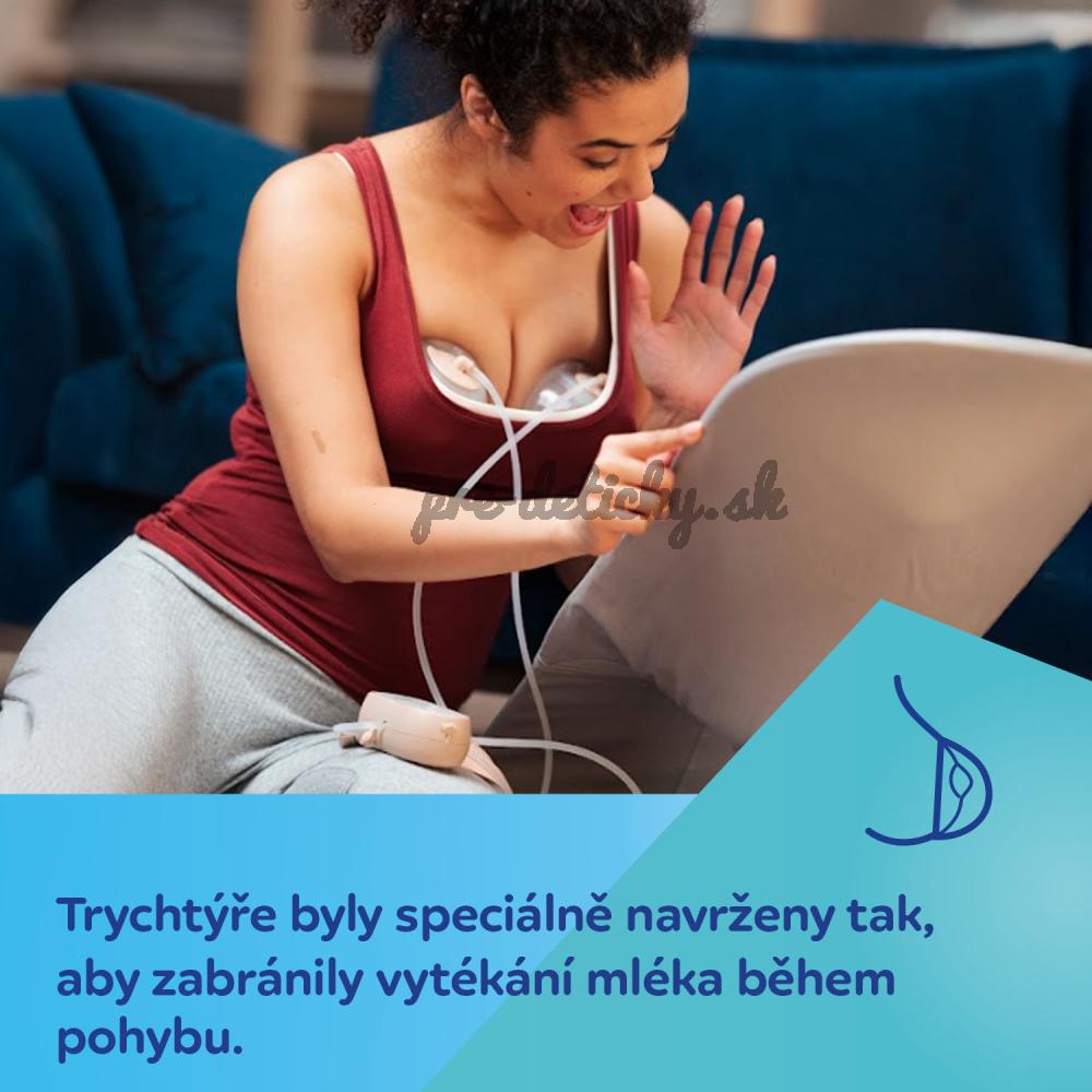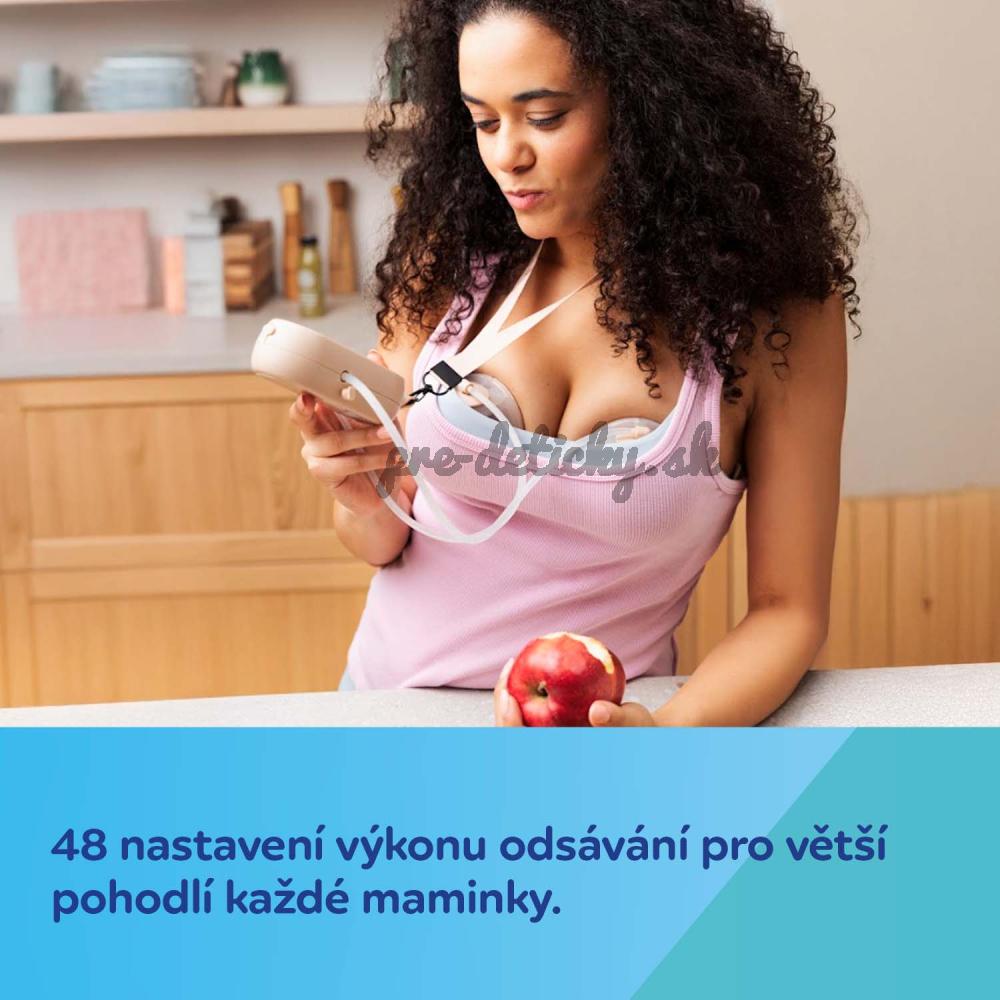 Veľmi ľahké zásobníky na mlieko poskytujú pohodlie pre väčšie prsia. Malý, ľahký ovládací panel (telo odsávačky) je možné jednoducho vložiť do vrecka. Šnúrka na zavesenie umožňuje nosiť odsávačku materského mlieka na krku alebo opasku a zvyšuje tak pohodlie pri každodennom používaní. Odsávačka materského mlieka je mimoriadne tichá – maximálne 50 decibelov v najintenzívnejšom režime.