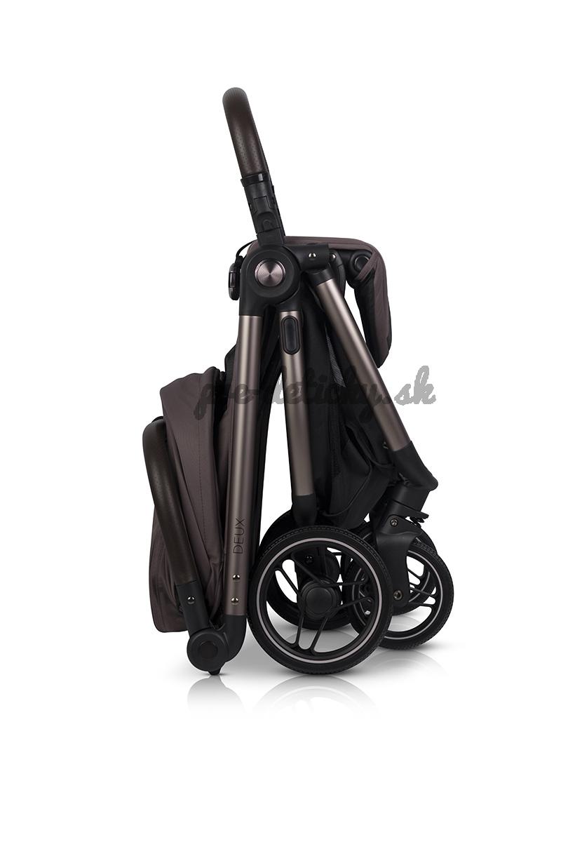DEUX je vybavený jedinečným automatickým skladacím systémom, ktorý ovládate iba jednou rukou. Stačí aktivovať mechanizmus a zatlačiť rukoväť dopredu – kočík sa automaticky zloží ako kyvadlo do prekvapivo kompaktných rozmerov. Po zložení stojí kočík vo zvislej poloze a zábrana slúži ako pohodlná rukoväť na prenášanie. Tento systém je obrovským uľahčením najmä v situáciách, keď nakládáte kočík do batožinového priestoru a súčasne musíte dohliadať na dve deti. Skladanie kočíka pre dvojčatá nikdy nebolo jednoduchšie.