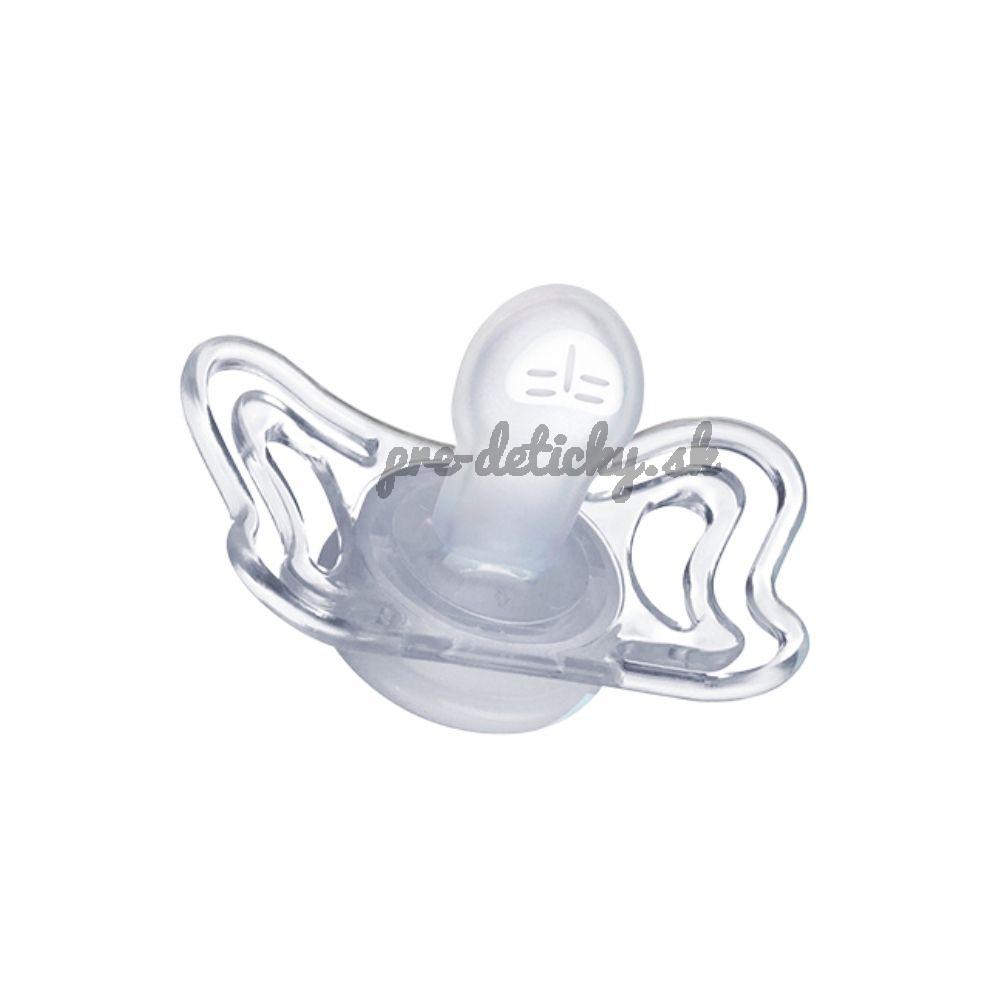 - extrémne mäkká zúžená pätička cumlíka umožňuje dieťaťu zavrieť ústa a redukuje riziko nerovnomerných zubných oblúkov (je ortodonticky korektná)