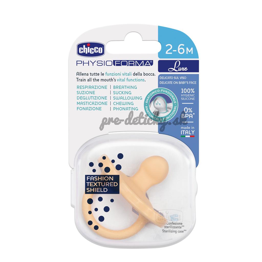 Cumlík Chicco Physio Luxe rady Physioforma patrí medzi aktívne ortodontické upokojujúce cumlíky. Štít cumlíka bol špeciálne navrhnutý tak, aby čo najmenšou možnou styčnou plochou s detskou tváričkou poskytol aj tej najcitlivejšej pokožke so sklonom k podráždeniu maximálny komfort. Dotýka sa okolia úst len v štyroch malých bodoch! Svojim jedinečným ergonomickým tvarom cumlík prirodzene podporuje správne fyziologické dýchanie novorodencov. Napomáha polohe jazyka smerom na podnebie, teda smerom dopredu a hore, a tak učí dieťatko dýchať správne nosom už od narodenia. Okrem toho tento anatomický cumlík podporuje správny vývoj čeľuste. Nesprávne dýchanie ústami totiž zvyšuje riziko SIDS, a tiež prispieva k nesprávnemu vývoju úst a sánky.