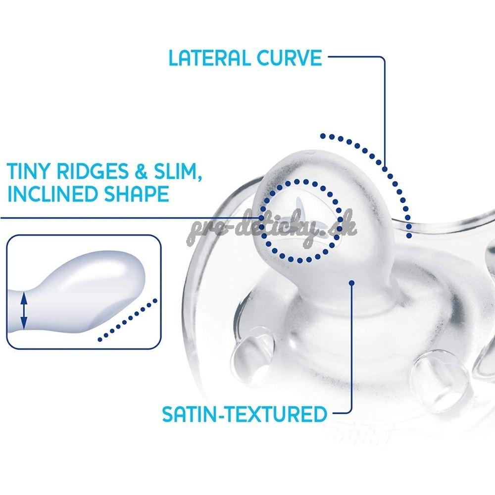 - extrémne mäkká zúžená pätička cumlíka umožňuje dieťaťu zavrieť ústa a redukuje riziko nerovnomerných zubných oblúkov (je ortodonticky korektná)