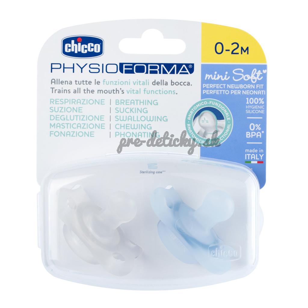 - Cumlík PhysioForma® Mini soft 0-2m je najmenší a najľahší cumlík talianskej značky Chicco. Jeho malé rozmery a kompaktný tvar, ktoré sú navrhnuté tak, aby ostali noštek a brada voľné, zaručujú maximálnu akceptáciu deťmi.