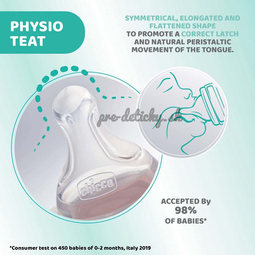 Chicco Perfect 5 je bio-funkčná dojčenská fľaša, ktorá sa prispôsobuje potrebám vášho dieťaťa vďaka intuitívnemu systému tečenia: inovatívny systém bol navrhnutý tak, aby podporoval a vedel sa prispôsobiť fyziologickému saniu každého dieťaťa, aby sa počas a po kŕmení cítilo spokojné a uvoľnené.