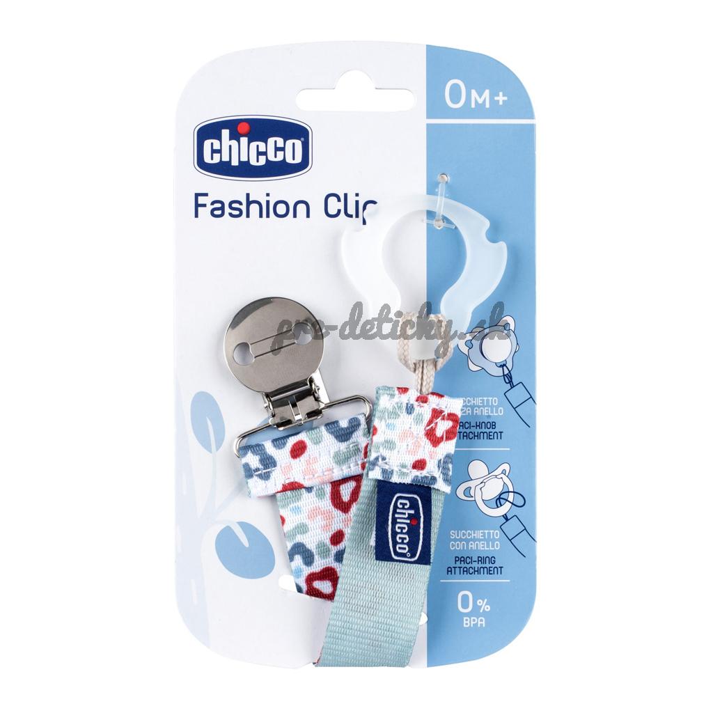 Univerzálny a módny klip Chicco Fashion je vhodný pre väčšinu cumlíkov. Vďaka nemu bude mať dieťatko aj vy svoj obľúbený cumlík vždy pri sebe a ostane tak dlhšie čistý. Potlač je obojstranná. Inovatívny dizajn umožňuje jednoduché pripevnenie na cumlíky. Na cumlíky s krúžkom ho jednoducho pripevníte pomocou šnúrky a cumlíky bez krúžka sa prichytia vďaka mäkkému krúžku na konci klipu.