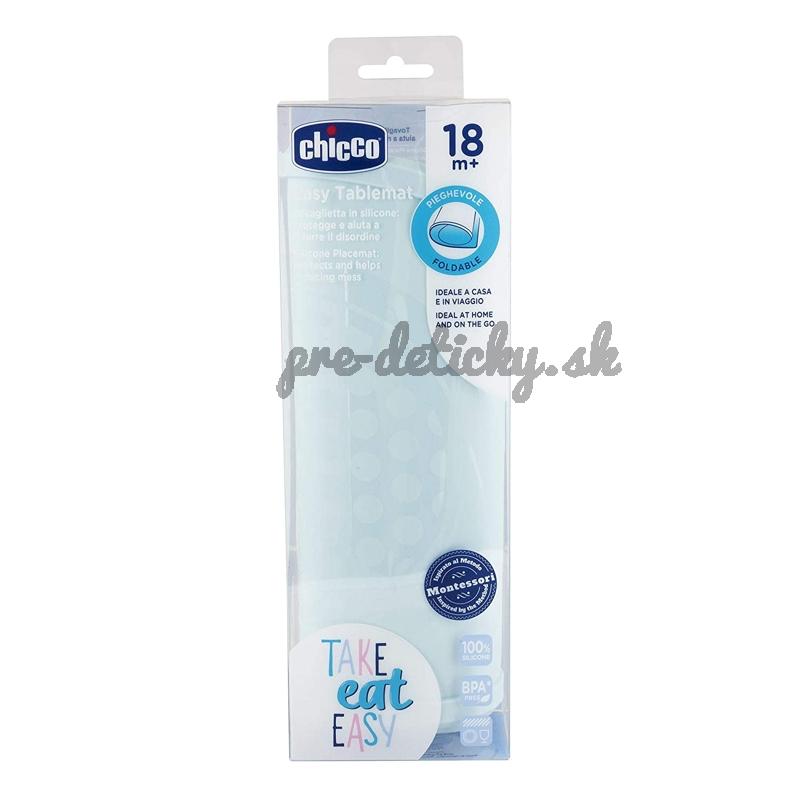 Silikónový prestieranie z evolučnej rady Chicco Take Eat Easy určenej na dosiahnutie samostatnosti pri jedení pomáha dieťaťu pomáha udržiavať poriadok na stole a v okolí. Inšpirácia metódou Montessori je v tom, že na prestieraní sú zobrazené tvary príborov, tanieru a pohárika. To povzbudzuje dieťa položiť riady na miesto, kam patria.