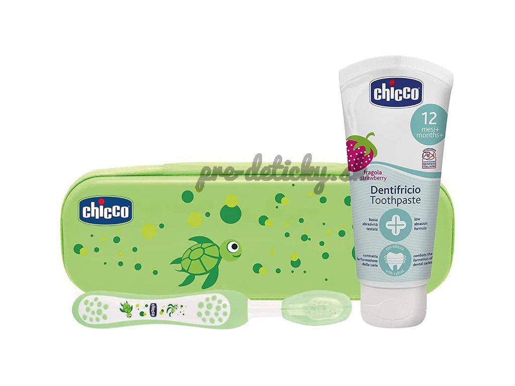 CHICCO Set zubná kefka a pasta s fluórom v puzdre Always Smiling zelená 12m+