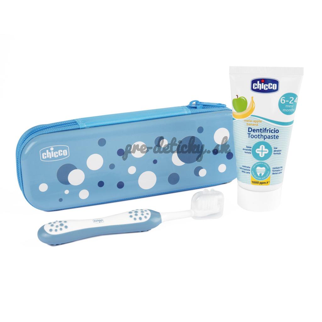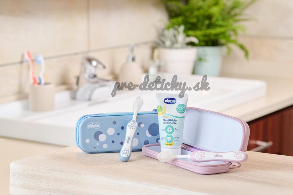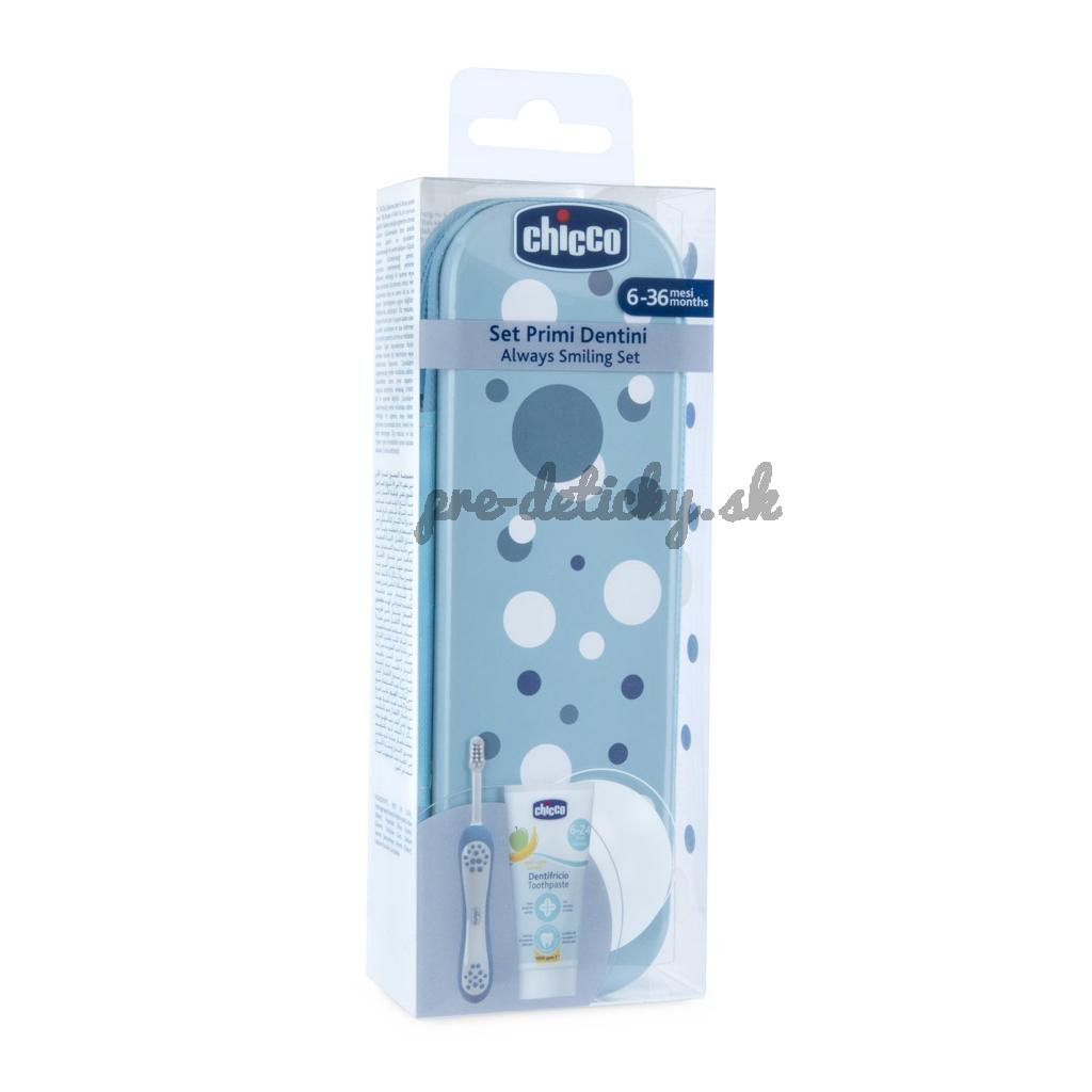CHICCO Set zubná kefka a pasta v puzdre Always smiling - light blue, 6m+