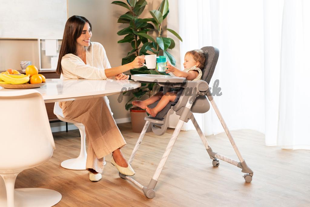 Jedálenská stolička sa dá výškovo nastaviť do 9 rôznych pozícii a prispôsobí sa tak výške, ktorú aktuálne potrebujete. Má 4 kolieska vďaka ktorým viete stoličku prakticky presúvať. Opierka chrbta sa dá nastaviť do úplného ľahu. Opierka nožičiek je rovnako nastaviteľná pre úplný komfort dieťaťa.