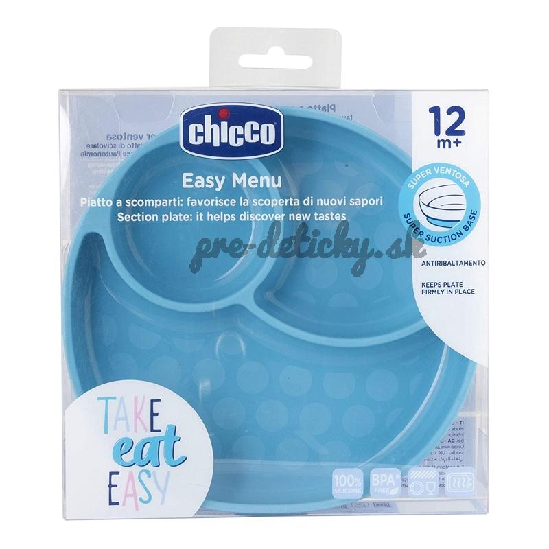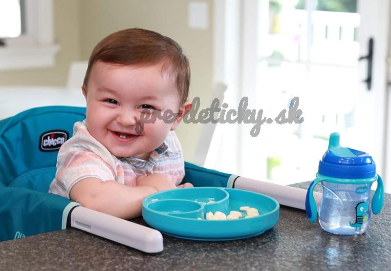 Silikónový tanier z evolučnej rady Chicco Take Eat Easy určenej na dosiahnutie samostatnosti pri jedení pomáha dieťaťu spoznávať nové chute. Tri rozdelené časti zabraňujú, aby sa rozličné jedlá dotýkali. Tak dieťaťu predstavíme tri rôzne chute.
