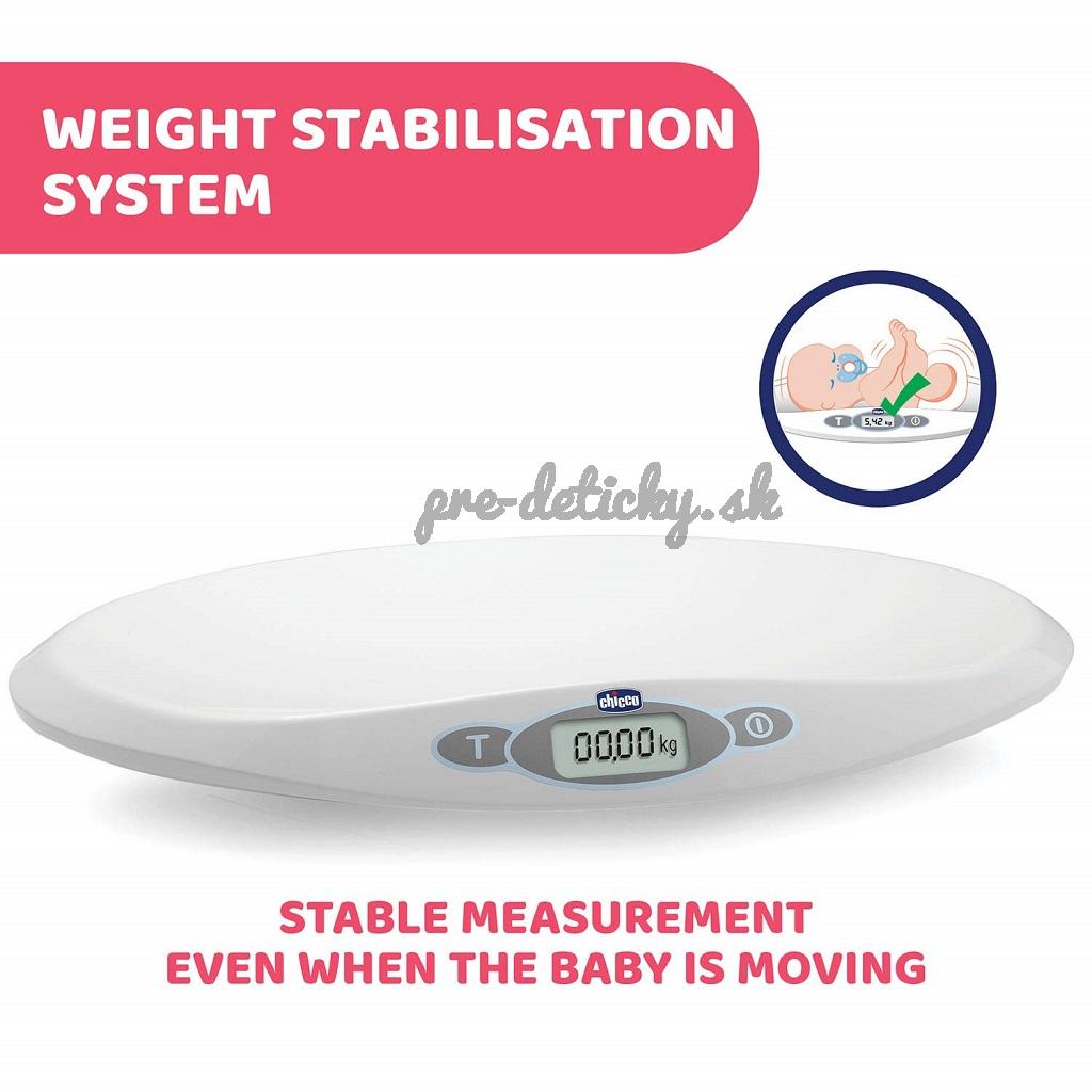 Sofistikovaný systém tlmenia vibrácií dokáže stabilizovať váženie, za účelom presného a rýchleho zistenia hmotnosti dieťaťa aj v prípade, že sa pohybuje. LCD displej umožňuje ľahké a okamžité čítanie. Zaznamenávanie posledného merania hmotnosti je užitočné a praktické. Na spodnej časti vážiacej plochy je zobrazené pravítko, ktoré Vám pomôže zistiť približnú výšku dieťaťa (až do 55 cm).